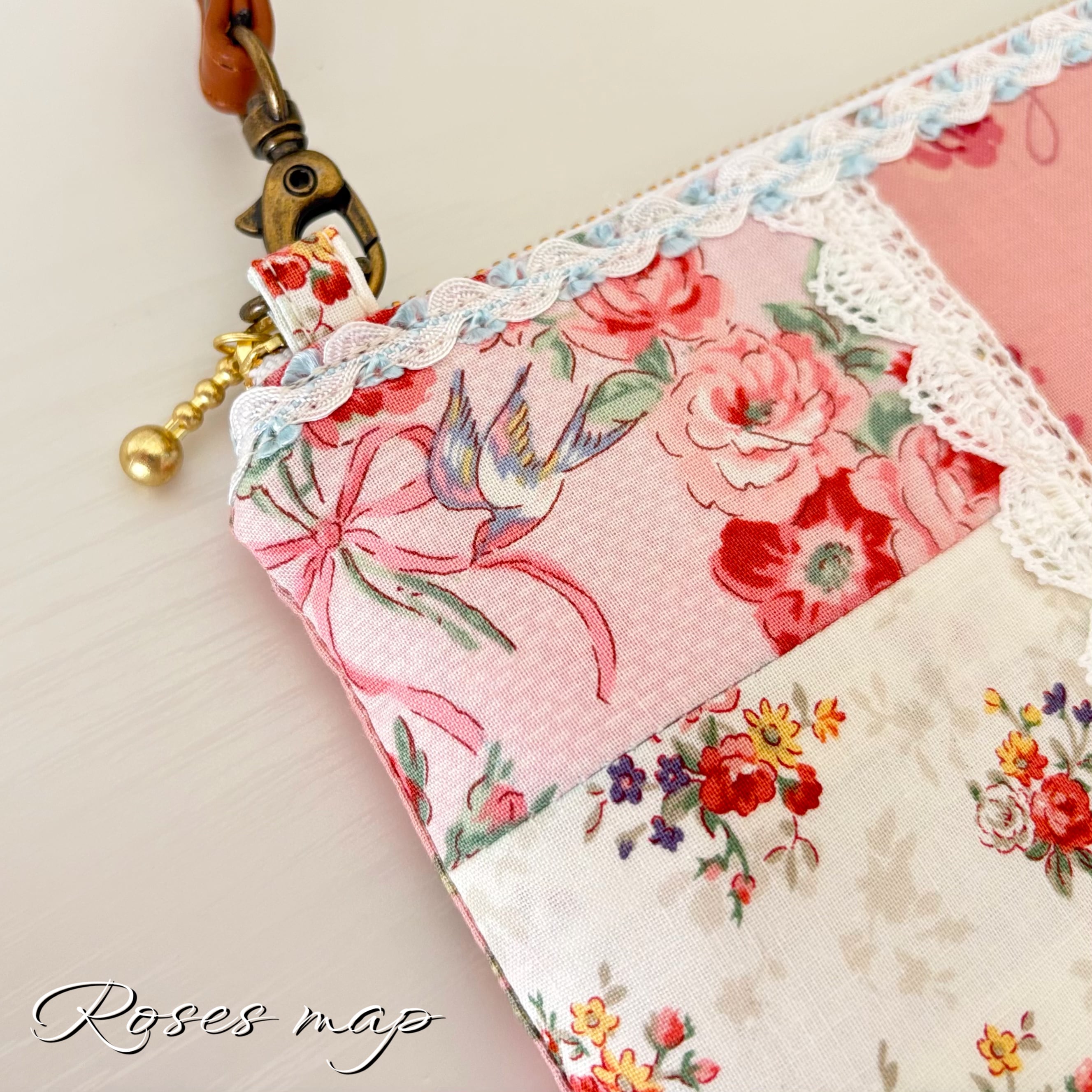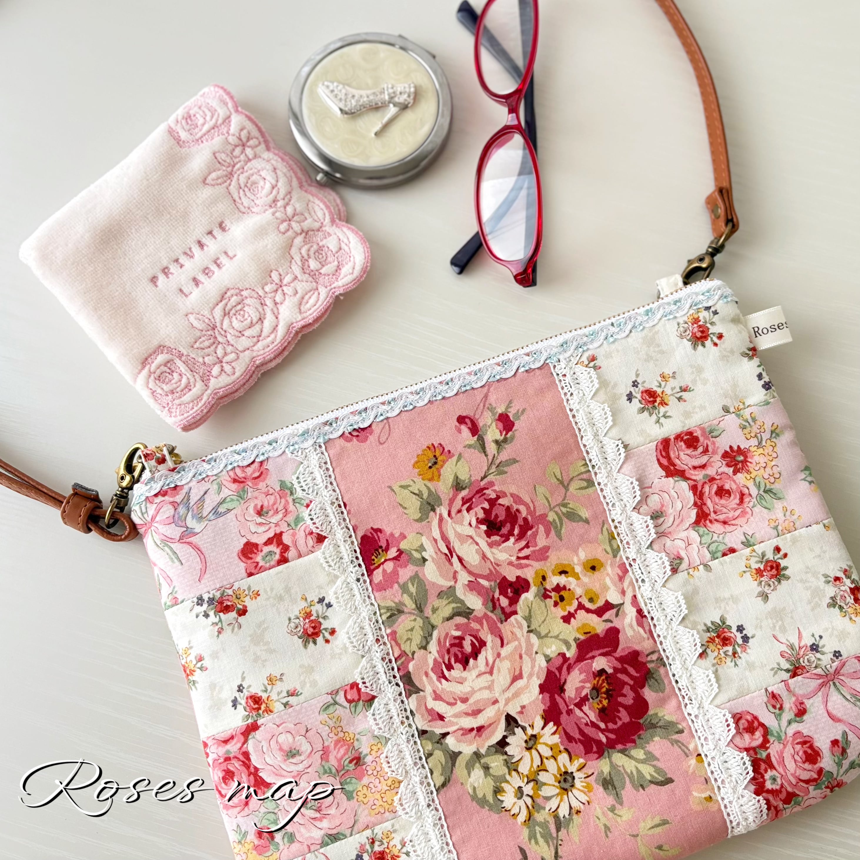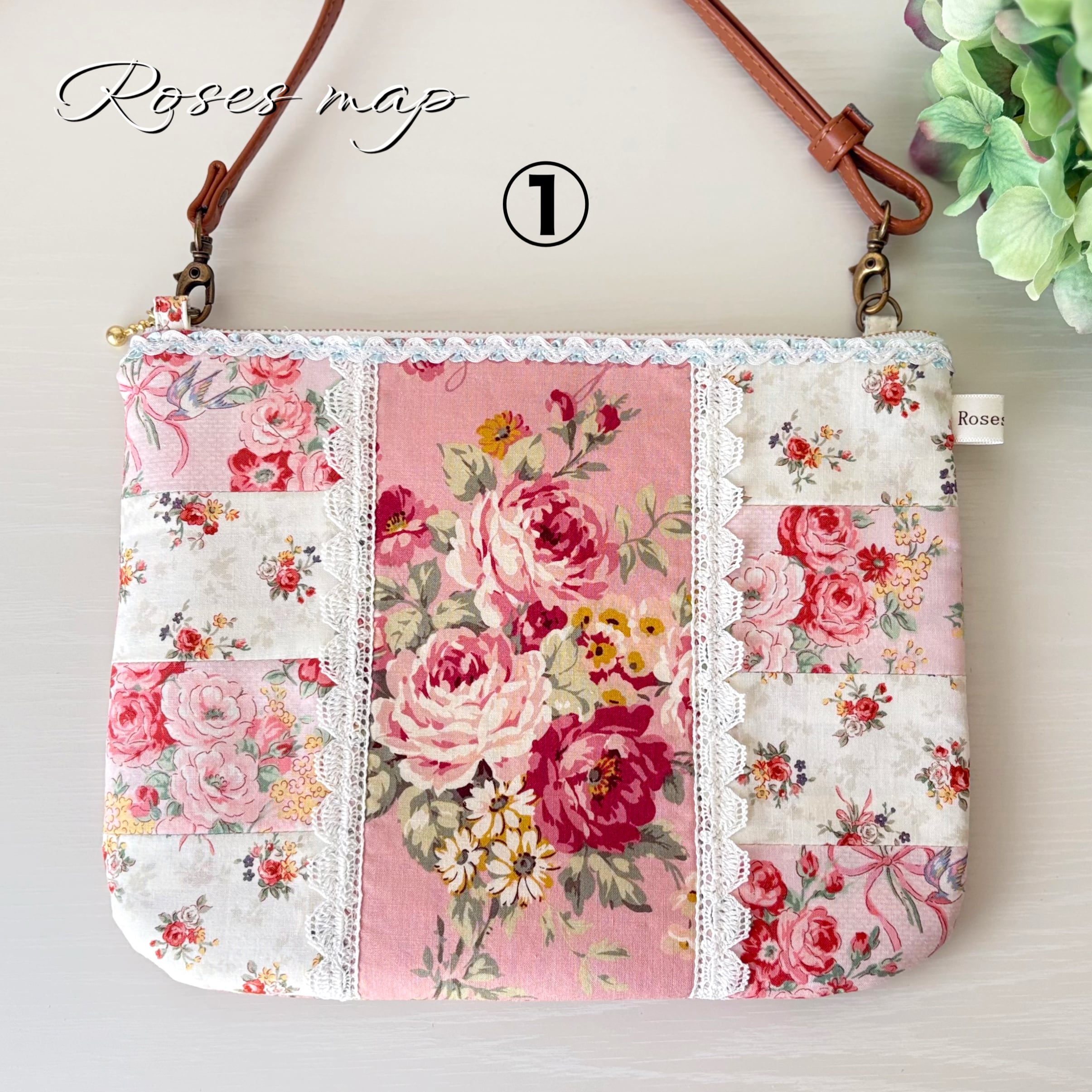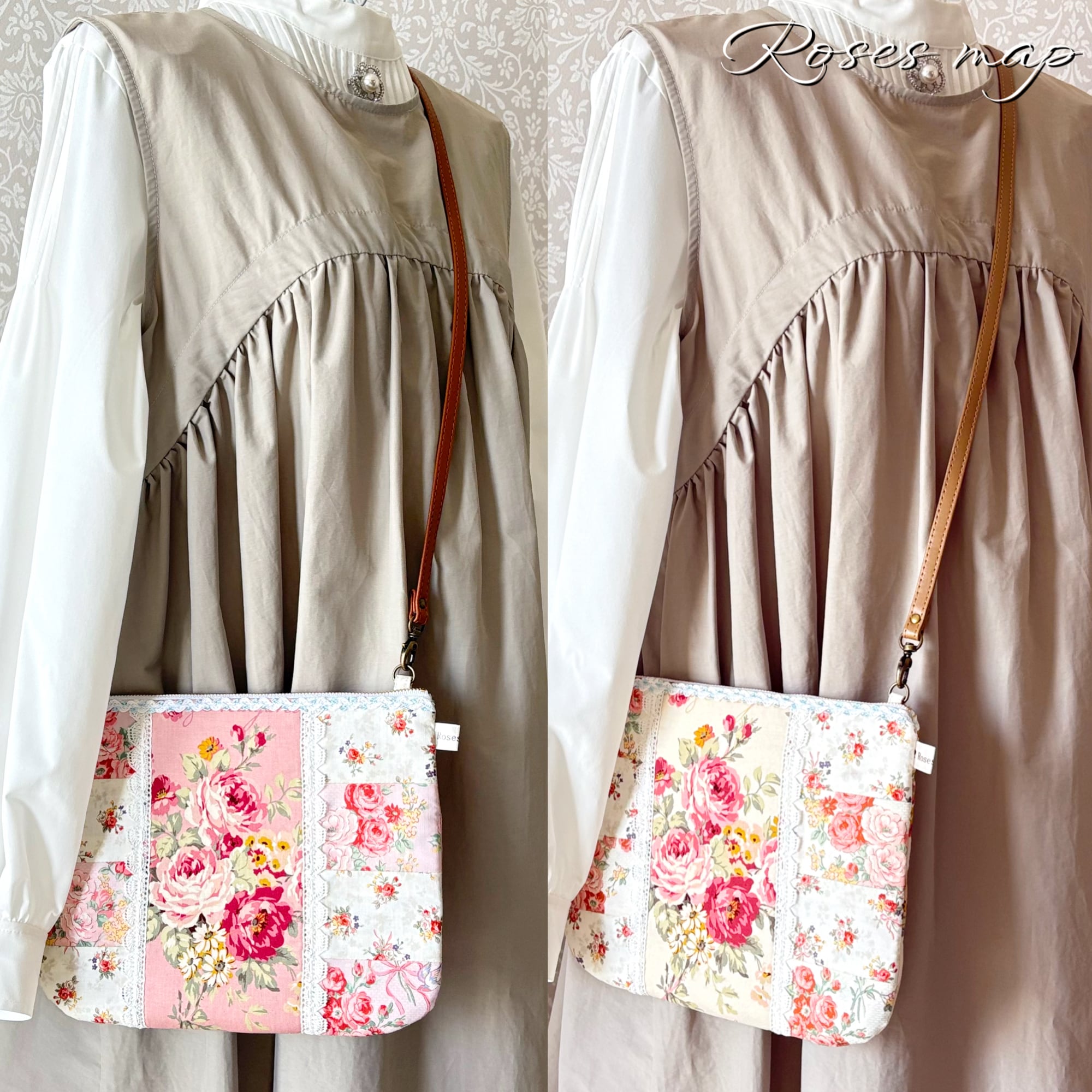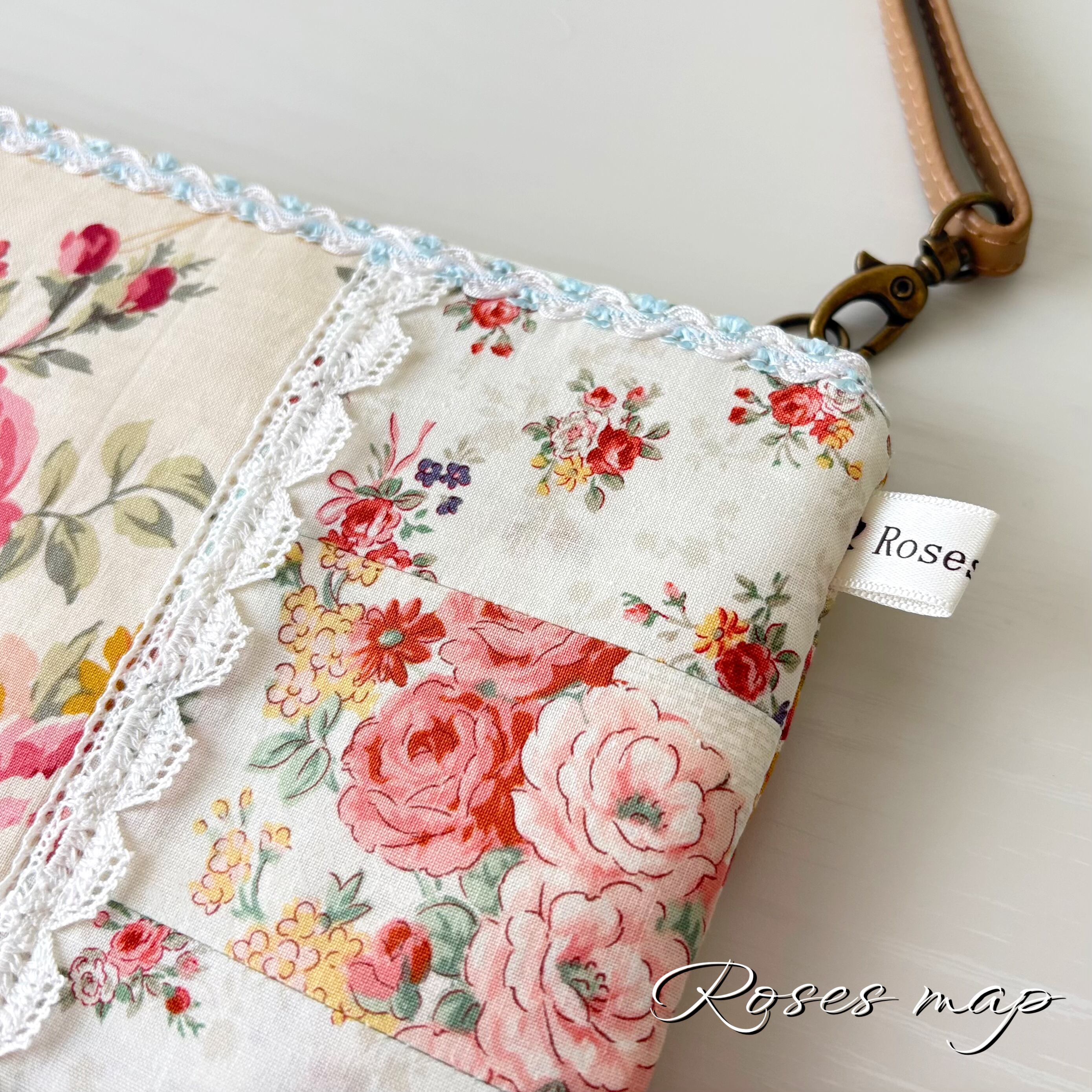 優しい薔薇柄の生地をパッチワーク風に仕立てたサコッシュタイプのショルダーバッグです。