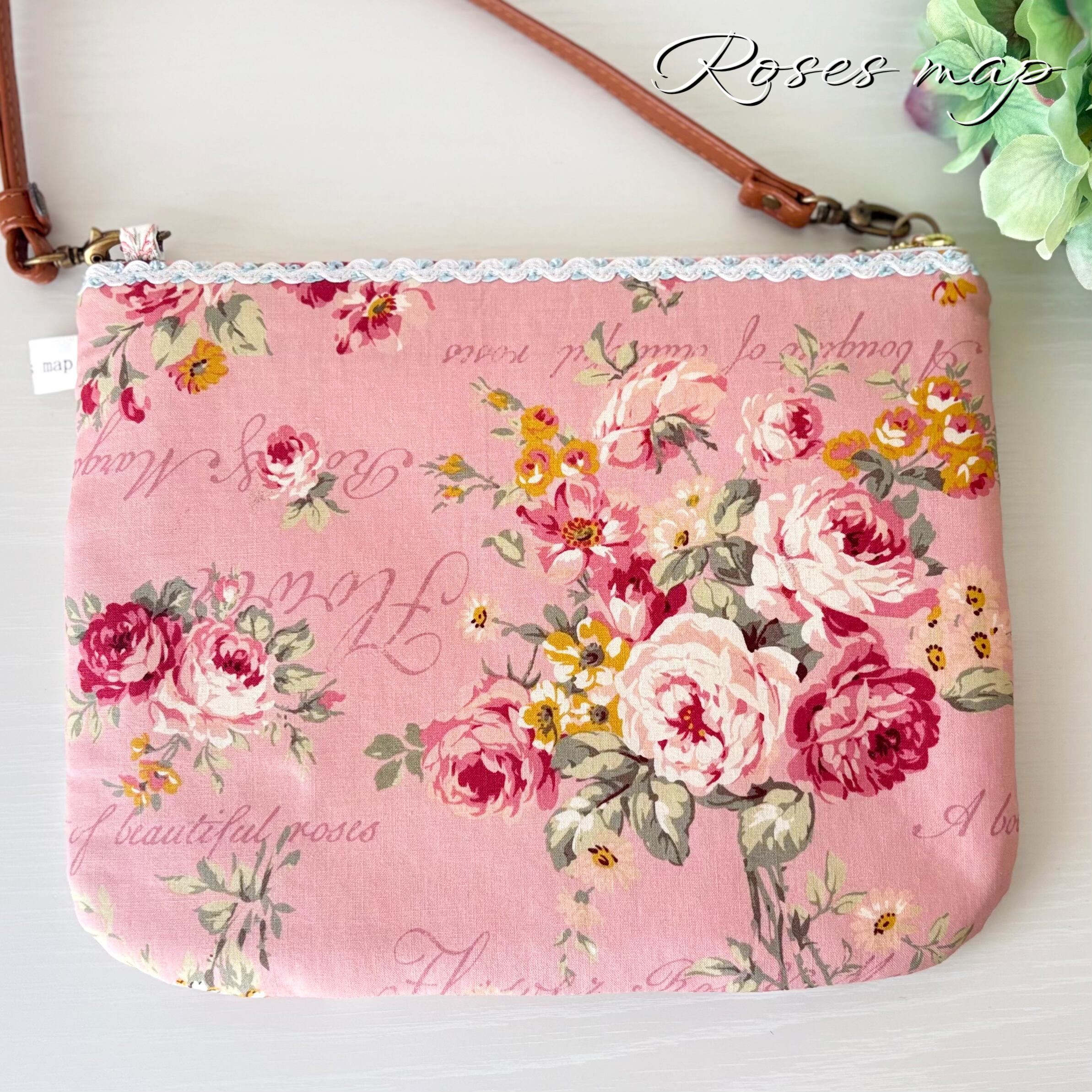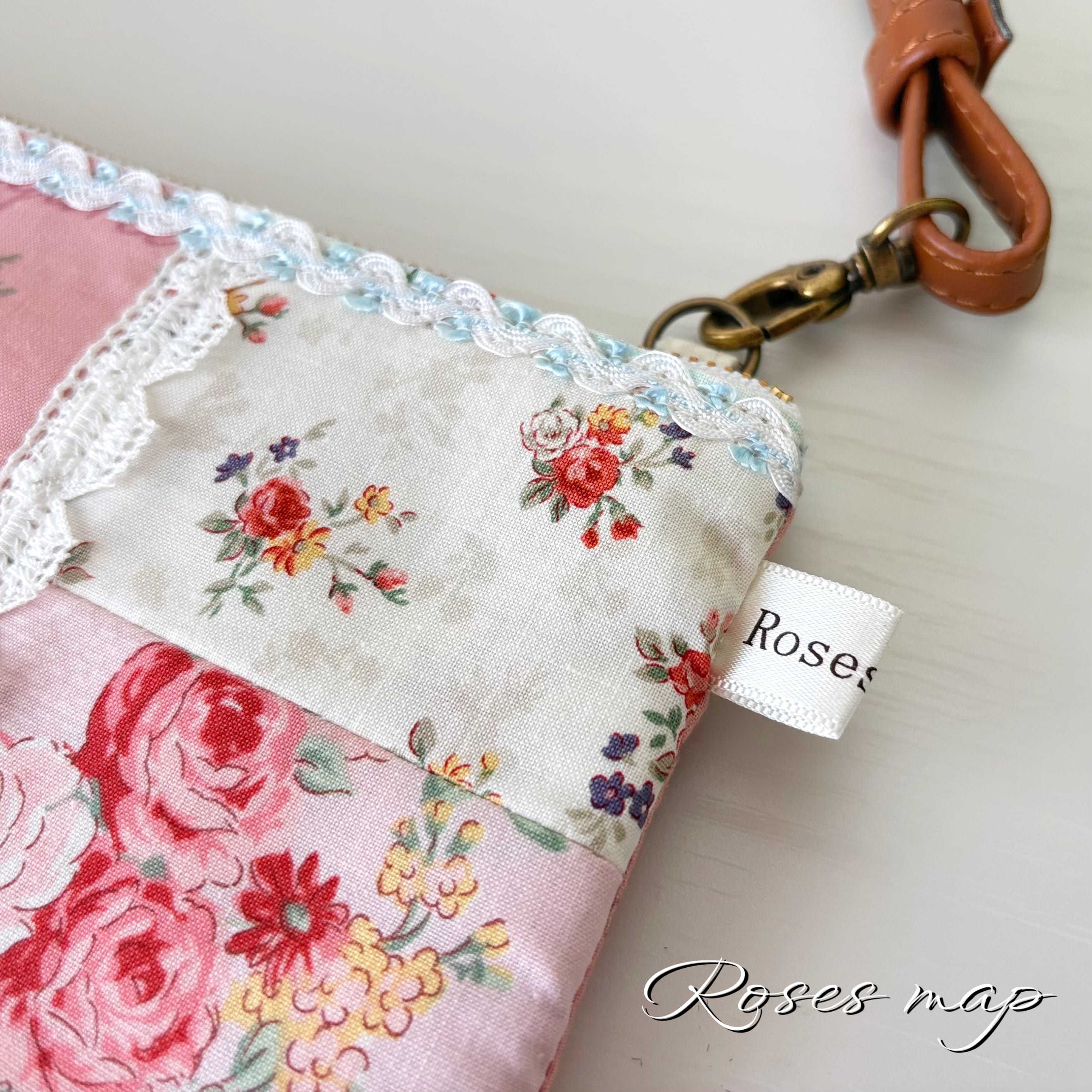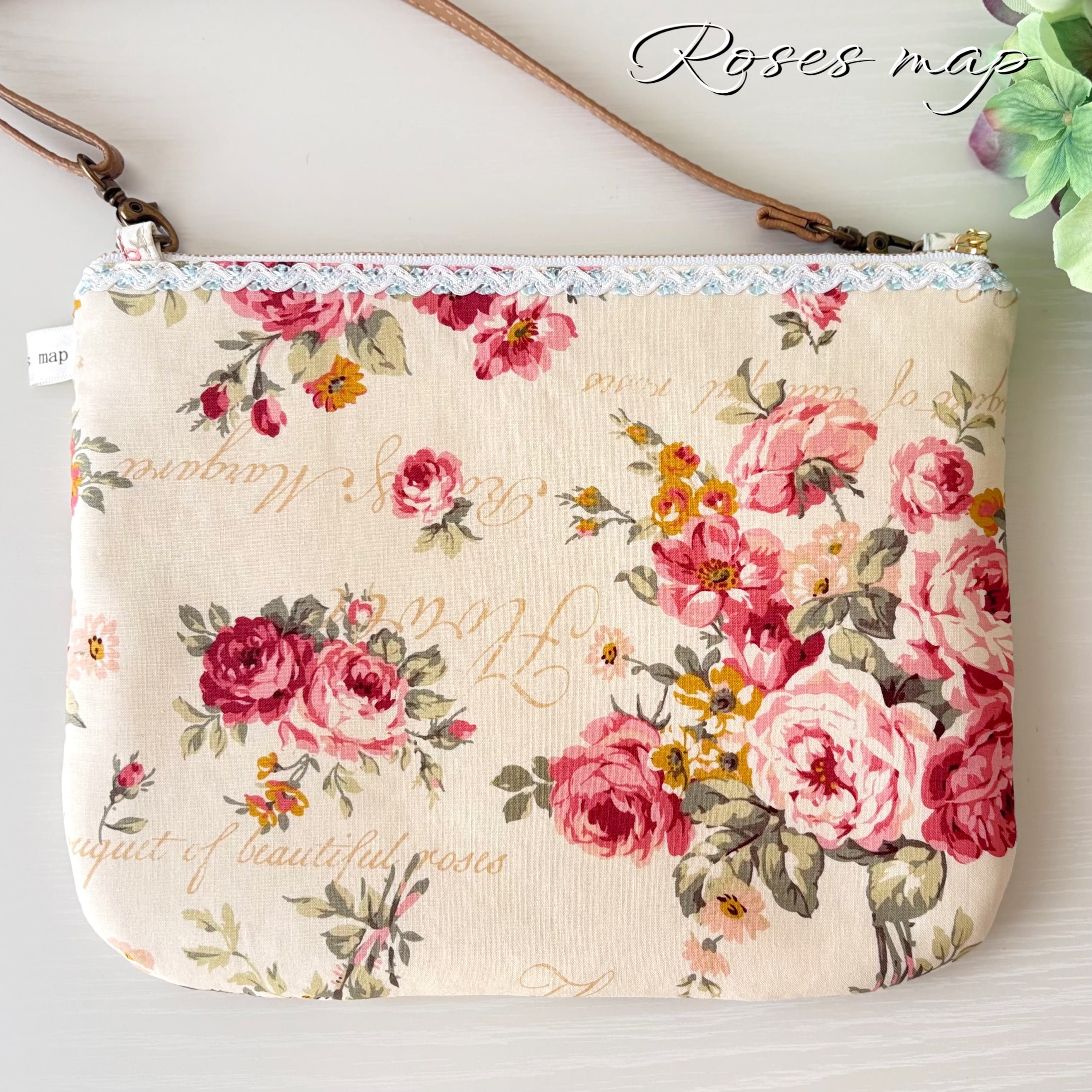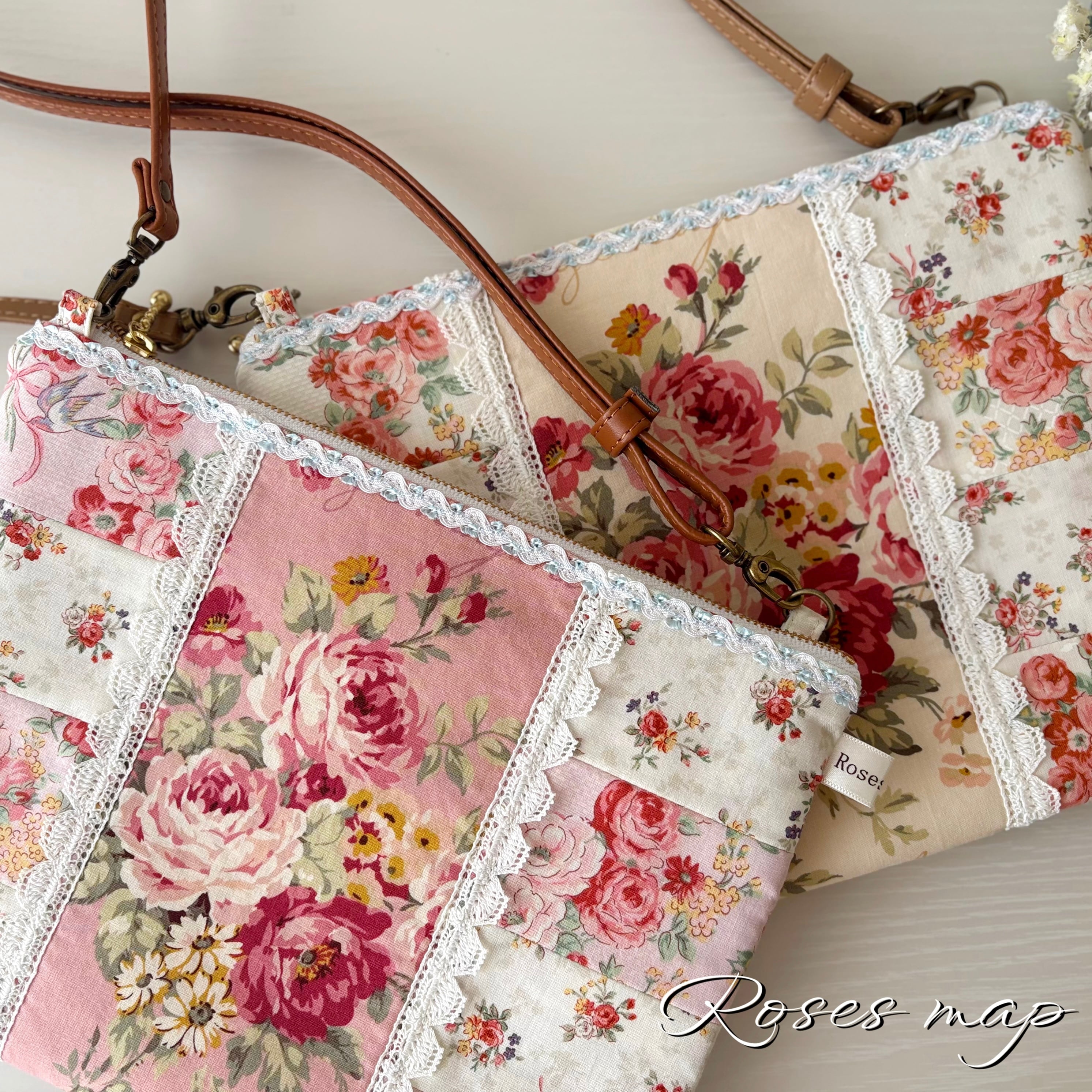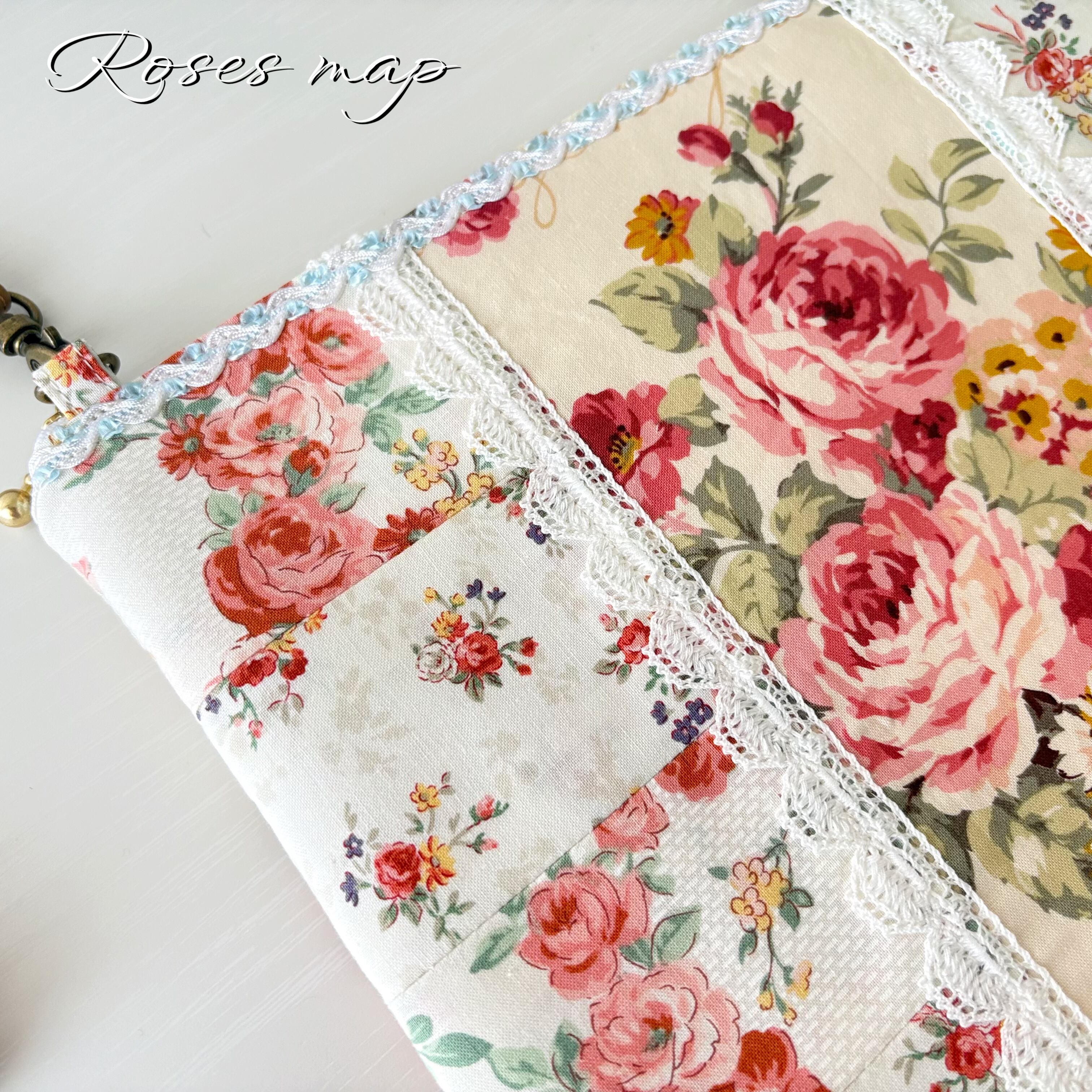 優しい薔薇柄の生地をパッチワーク風に仕立てたサコッシュタイプのショルダーバッグです。