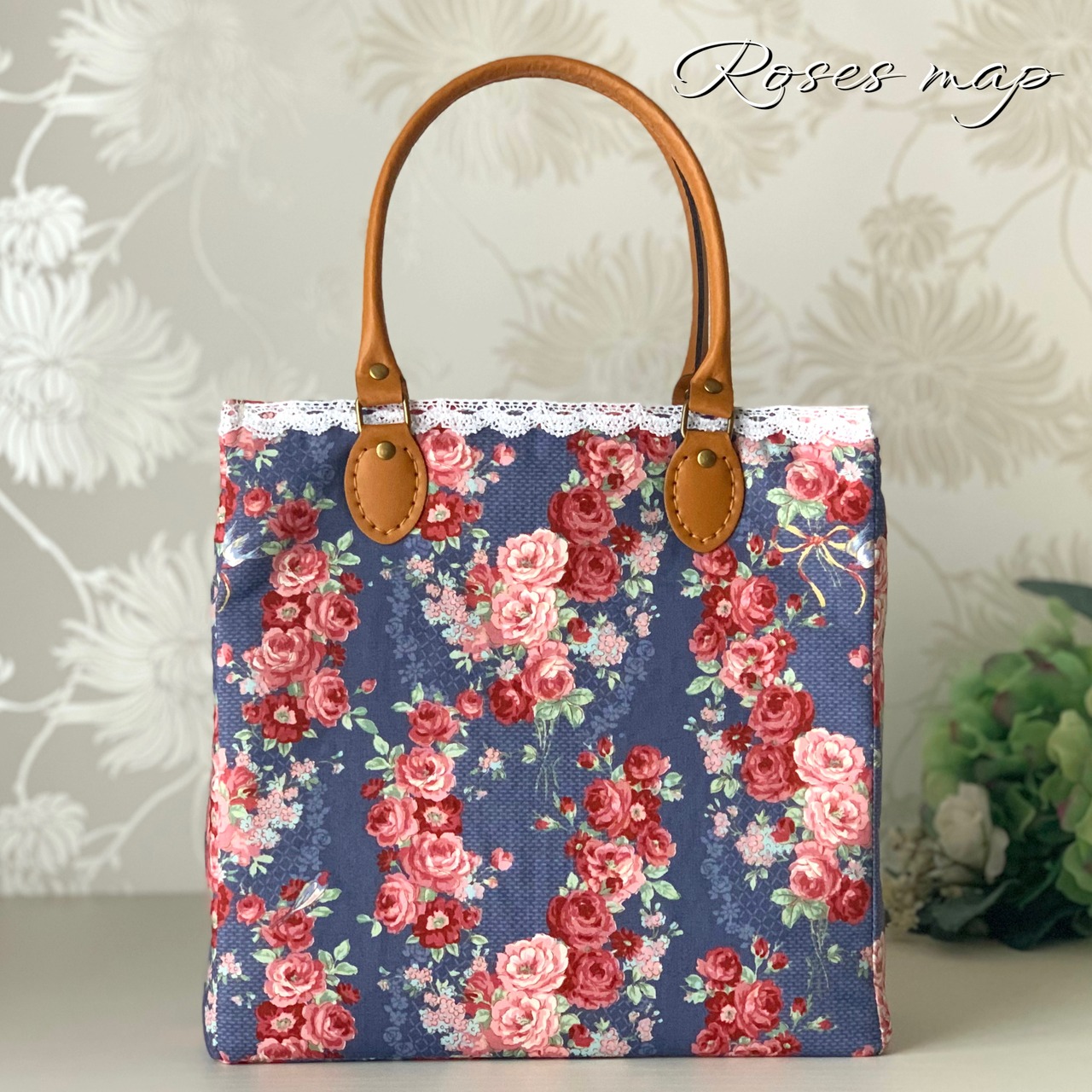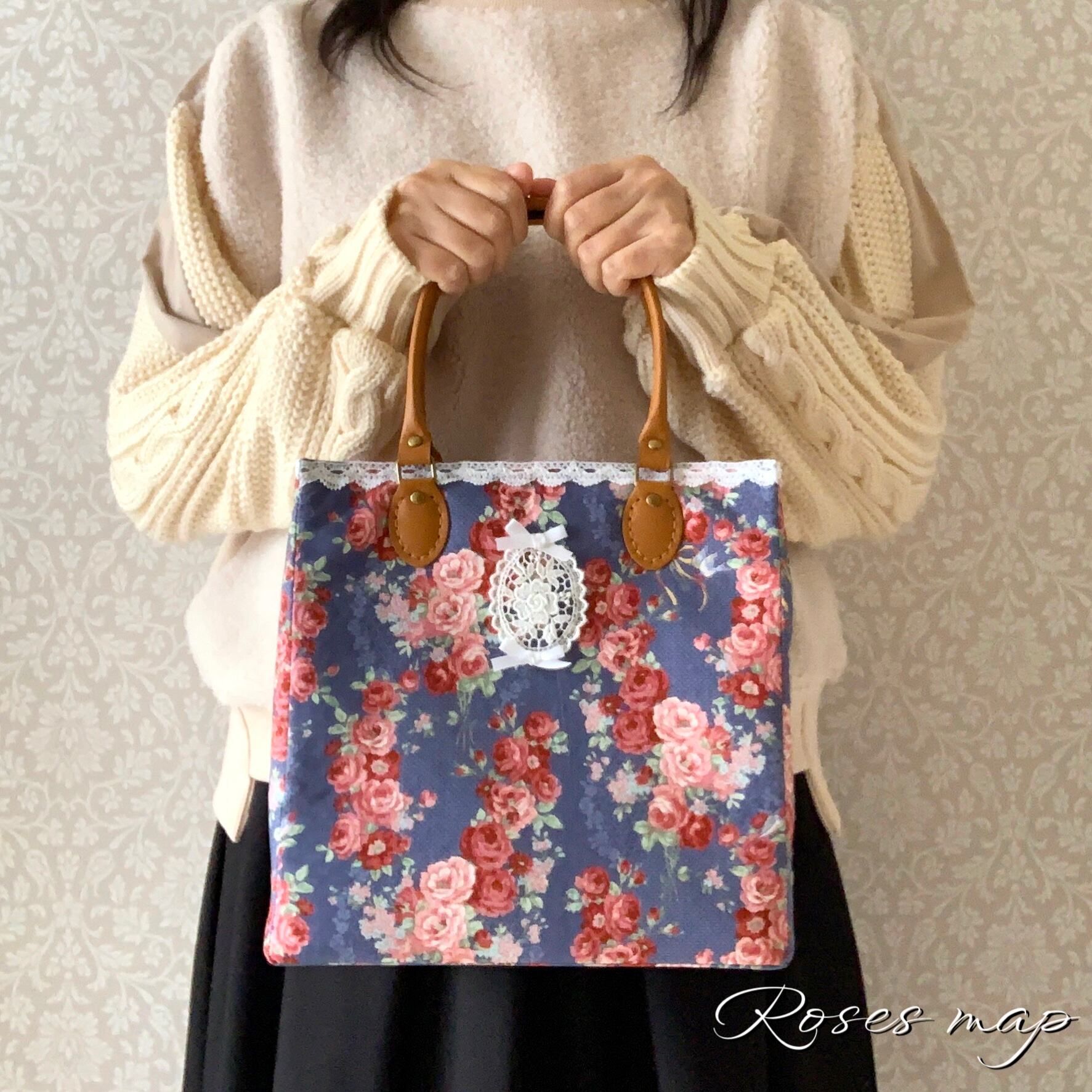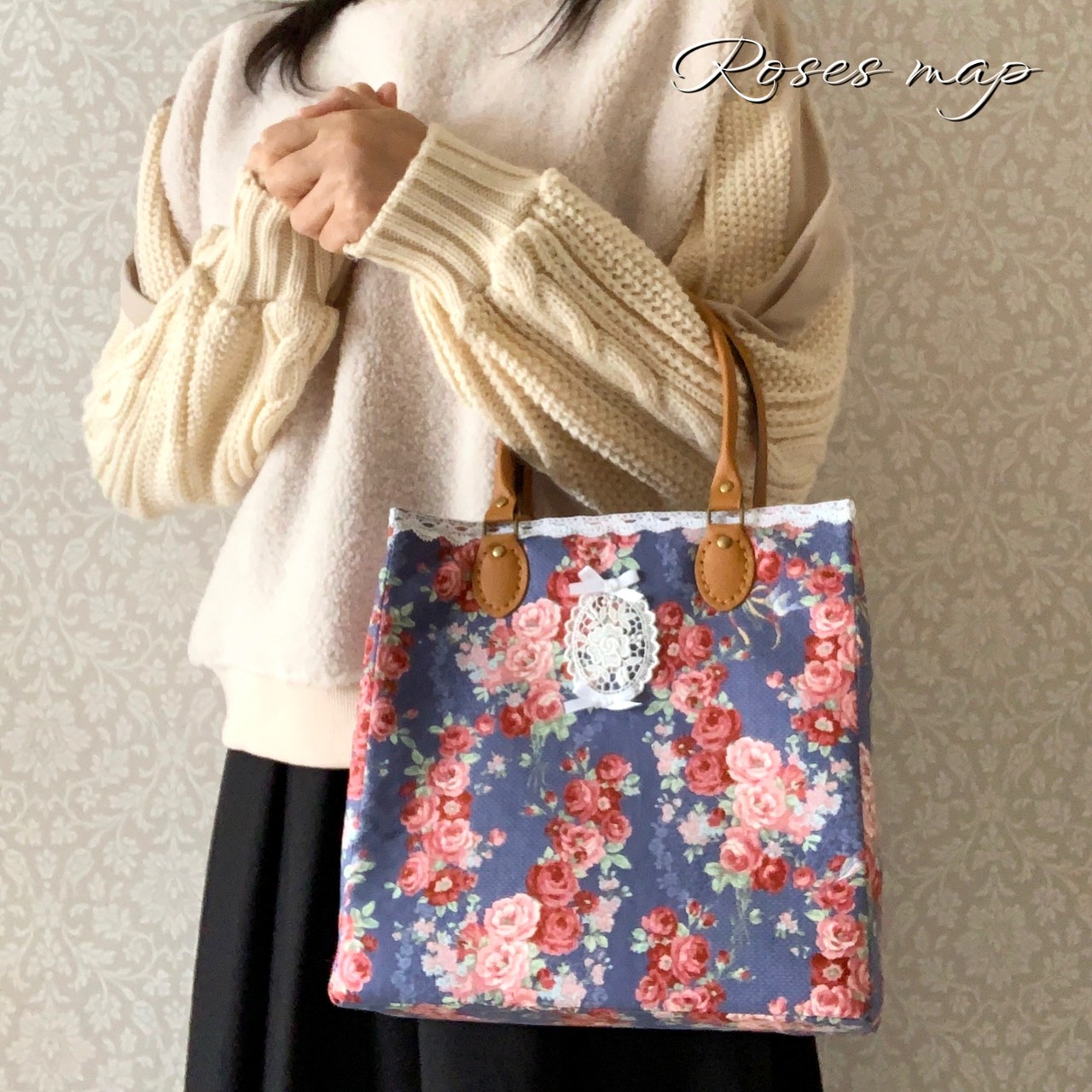 (BT-47)【バッグ】トート 内ポケット1つ バラのモチーフ おしゃれ小物 薔薇小物 ローズ雑貨 ブルー系