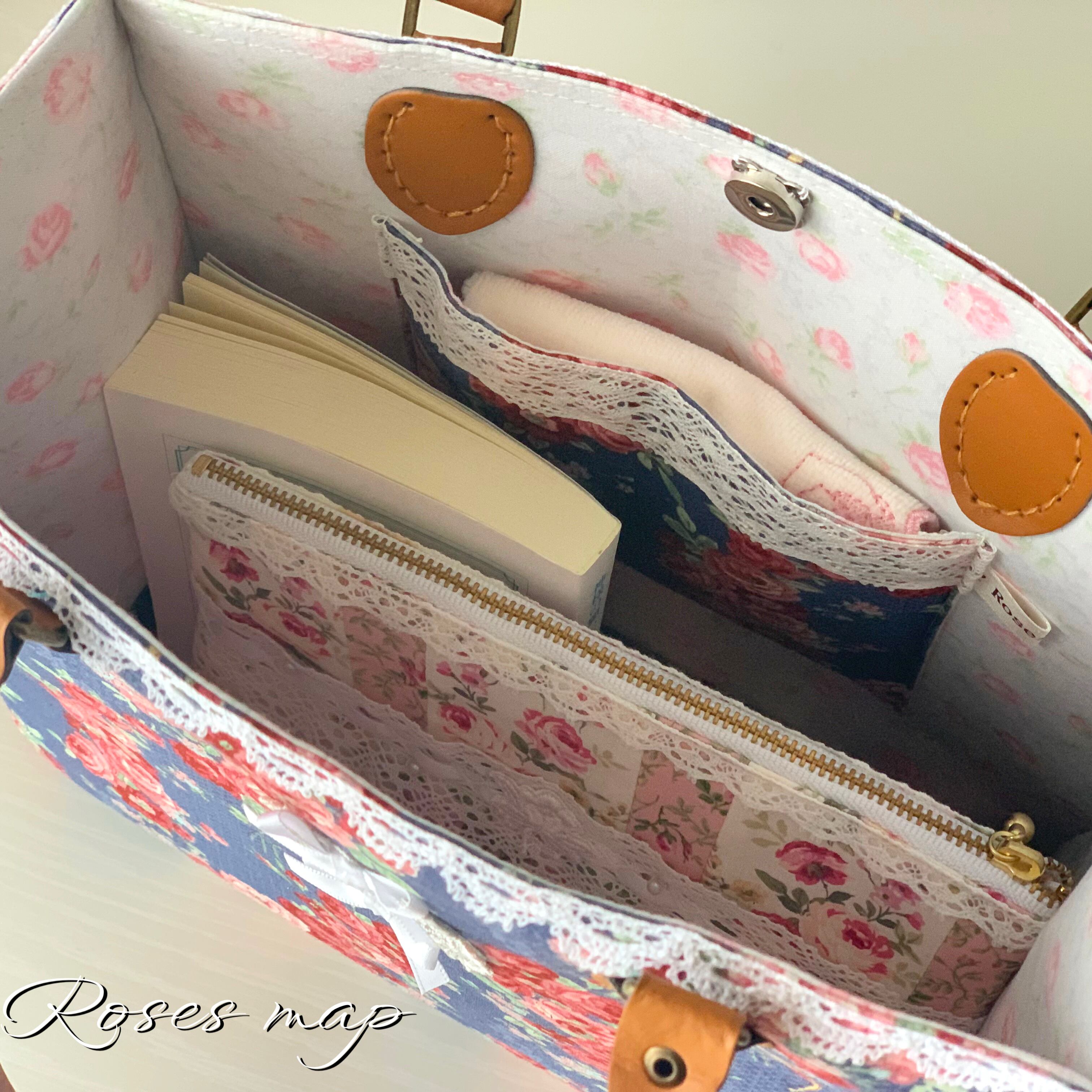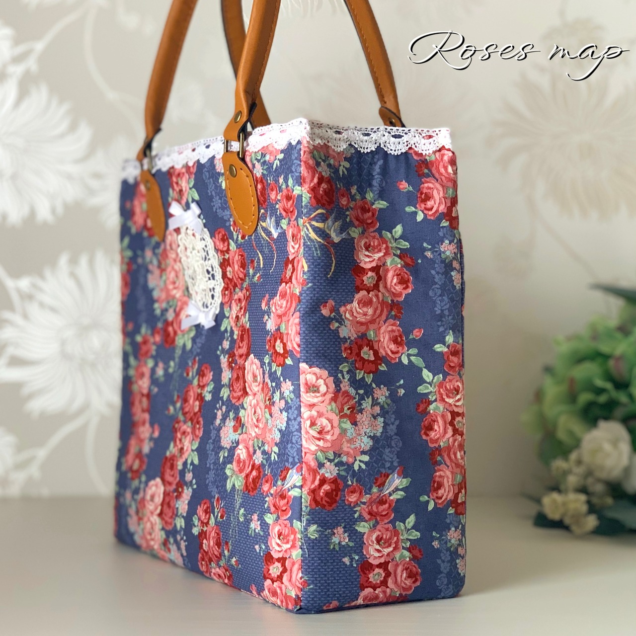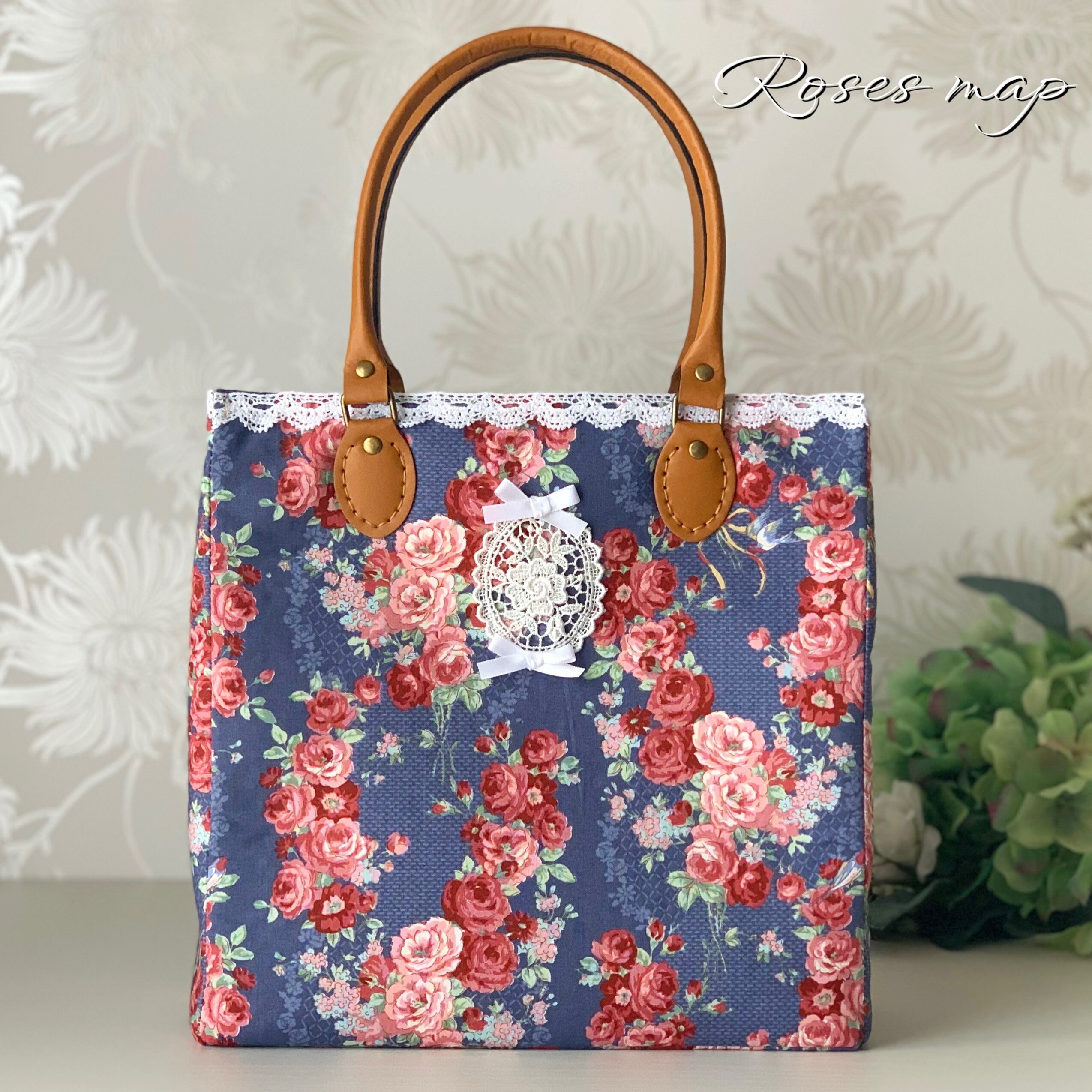 (BT-47)【バッグ】トート 内ポケット1つ バラのモチーフ おしゃれ小物 薔薇小物 ローズ雑貨 ブルー系