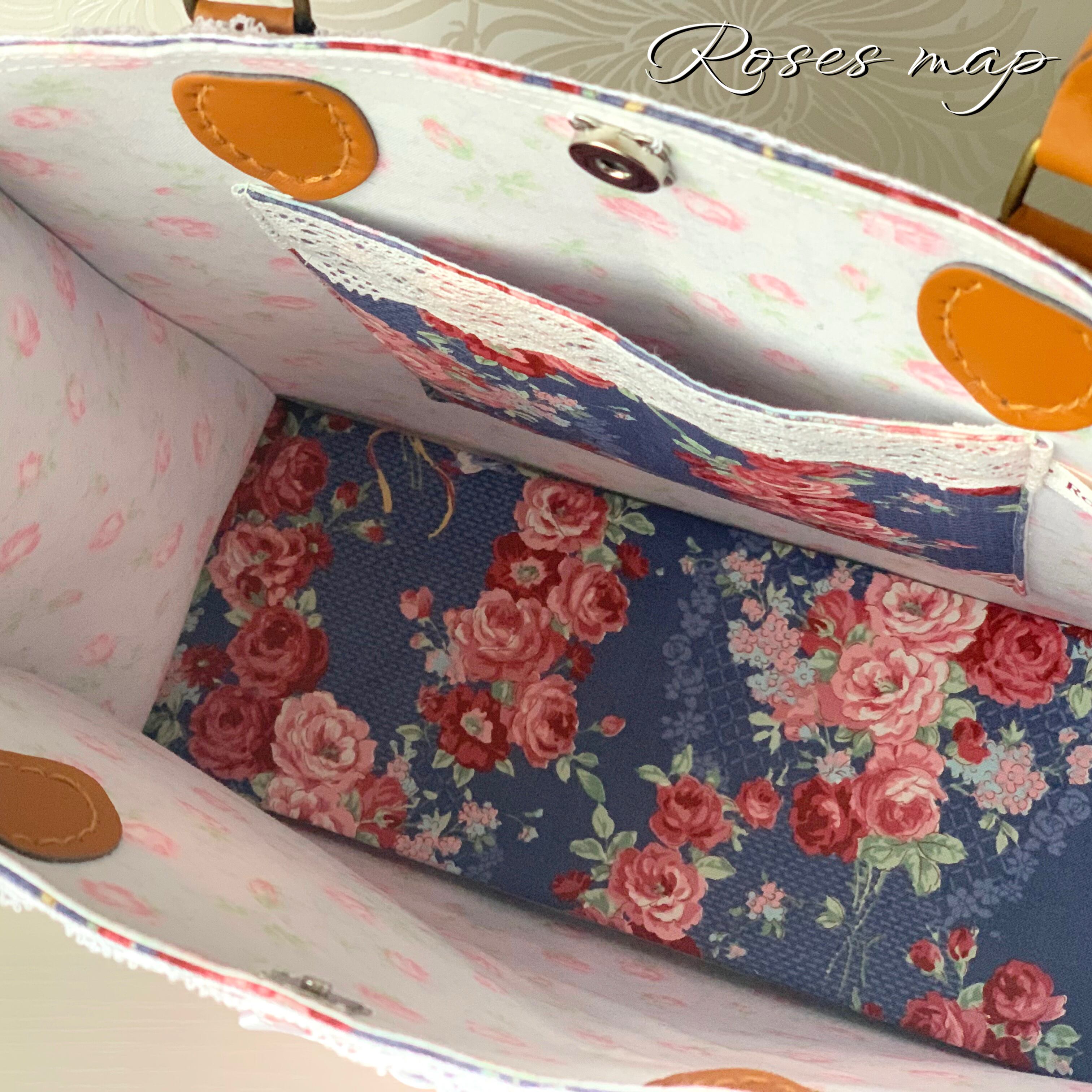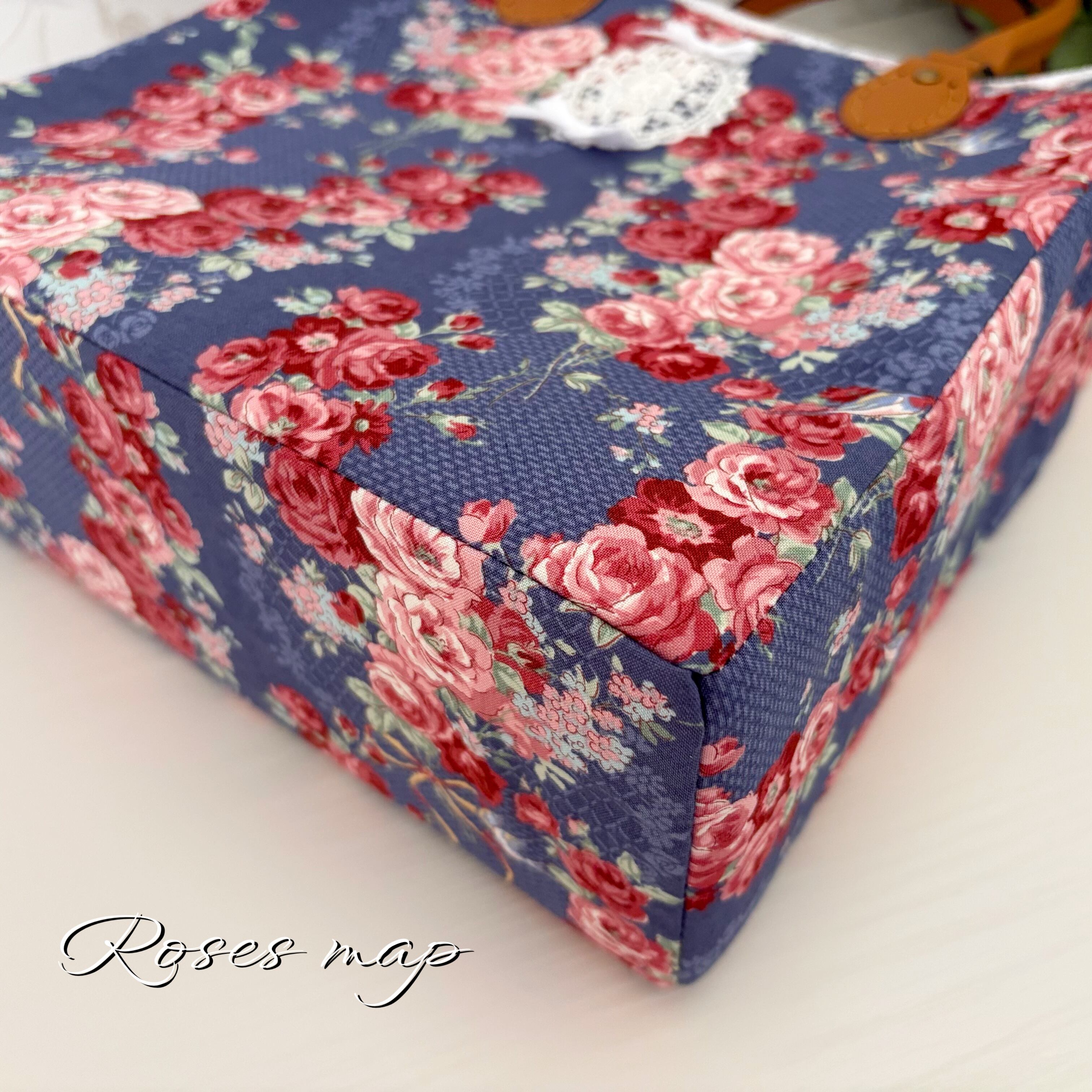 落ち着いた色合いの薔薇生地にモチーフがアクセントのトートバッグ。