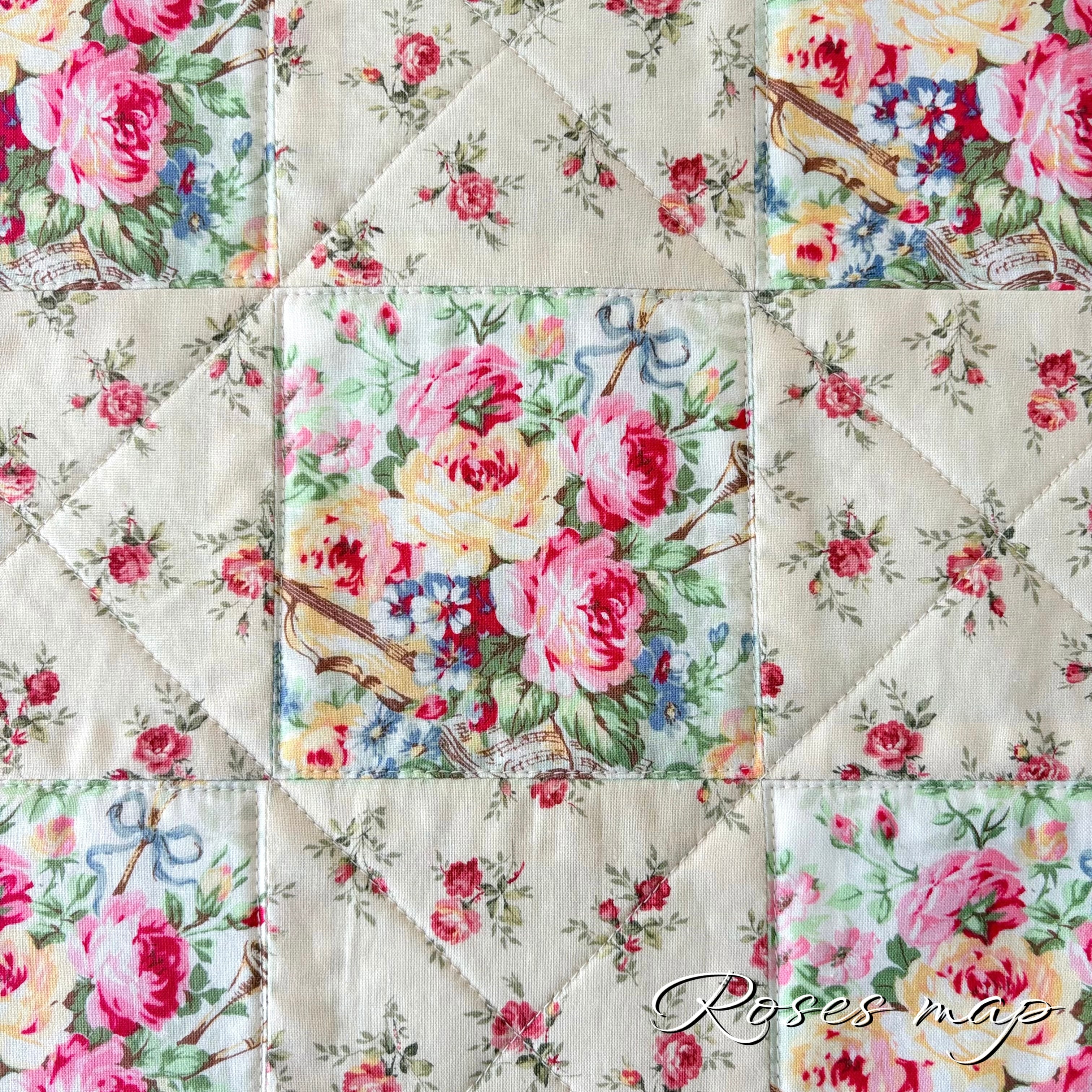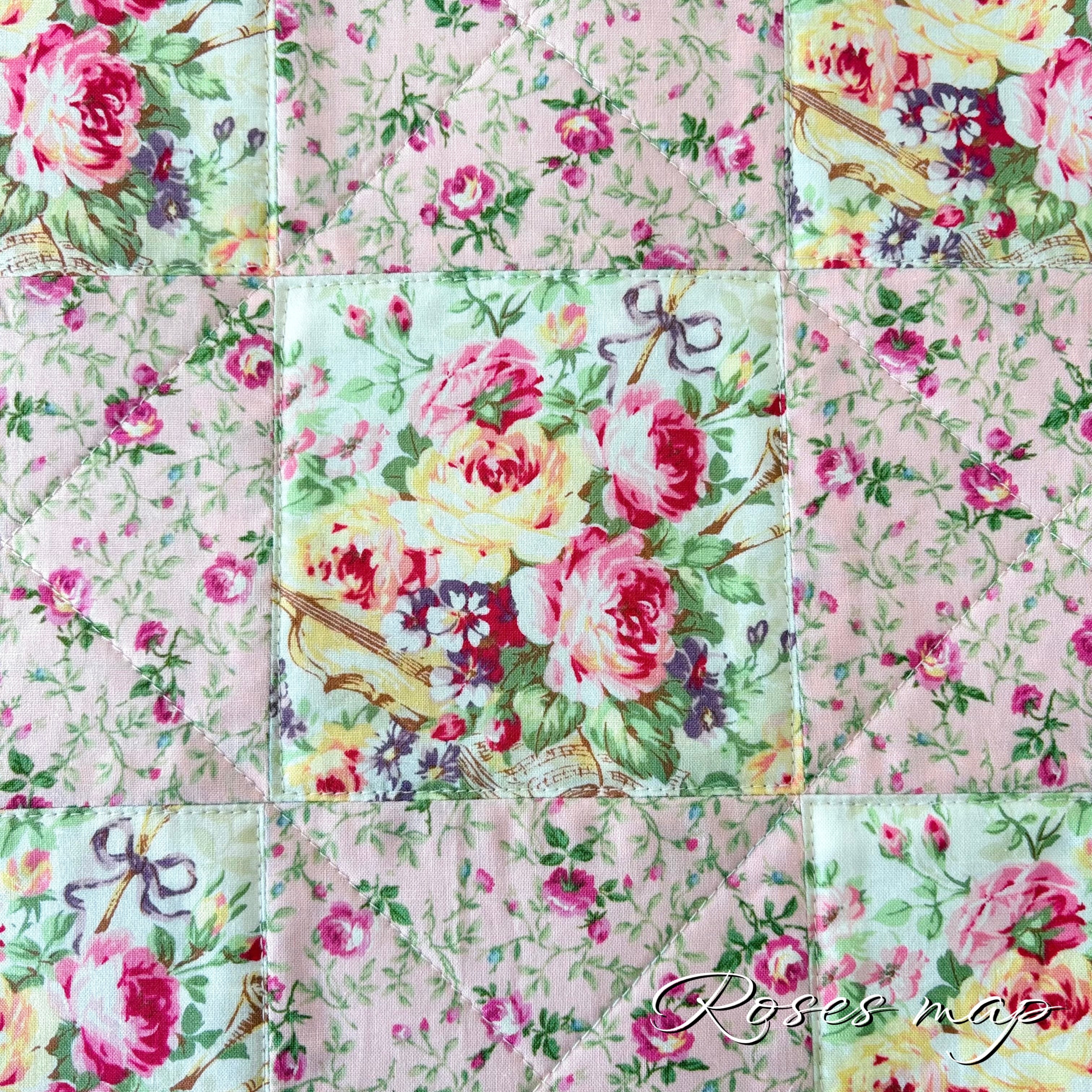 やさしい薔薇柄の生地を組み合わせて仕立てたパッチワークのインテリアマット。