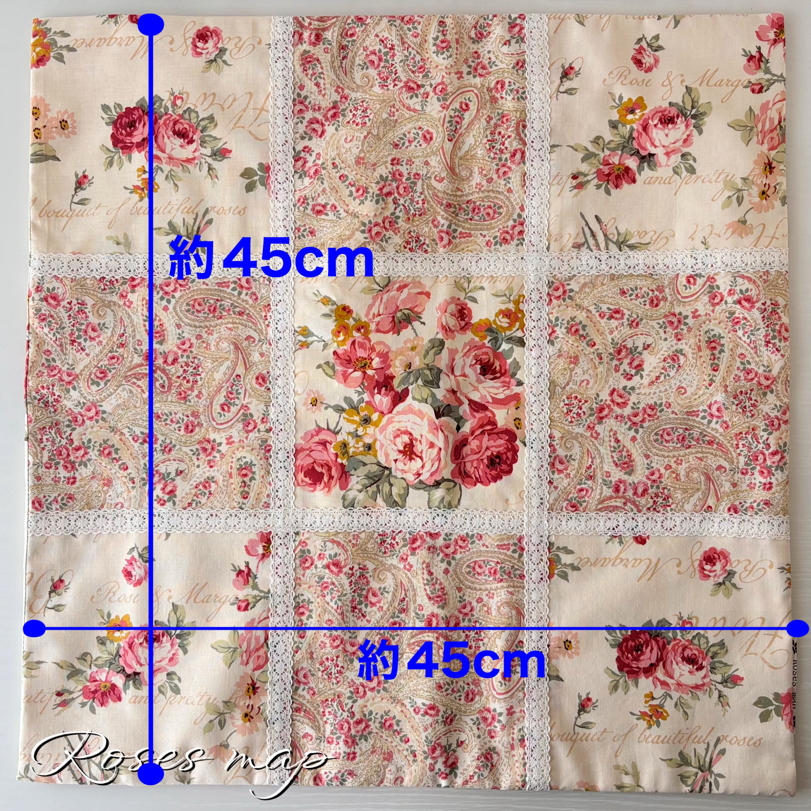 異なる薔薇柄を丁寧に組み合わせた、上品で華やかなクッションカバーです。