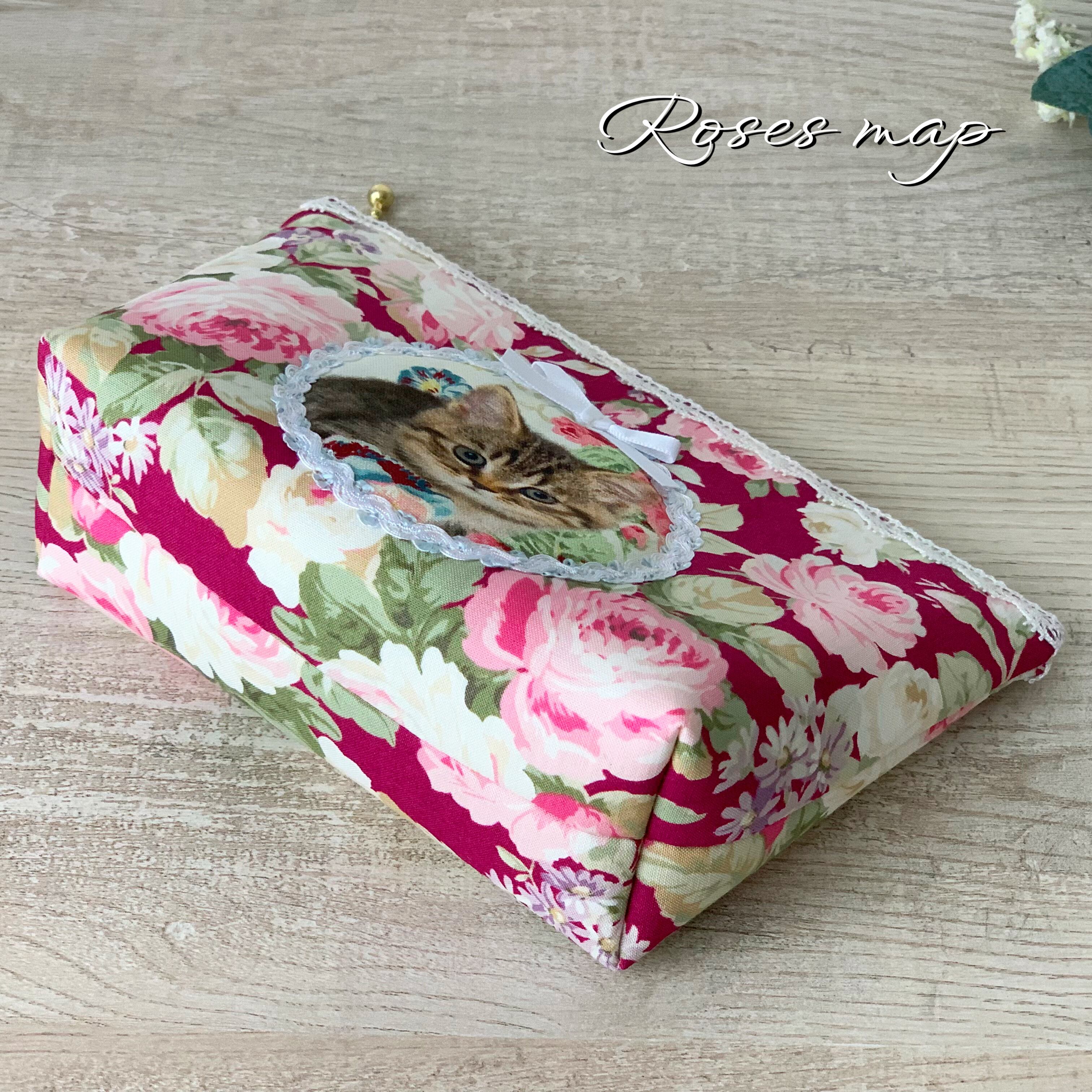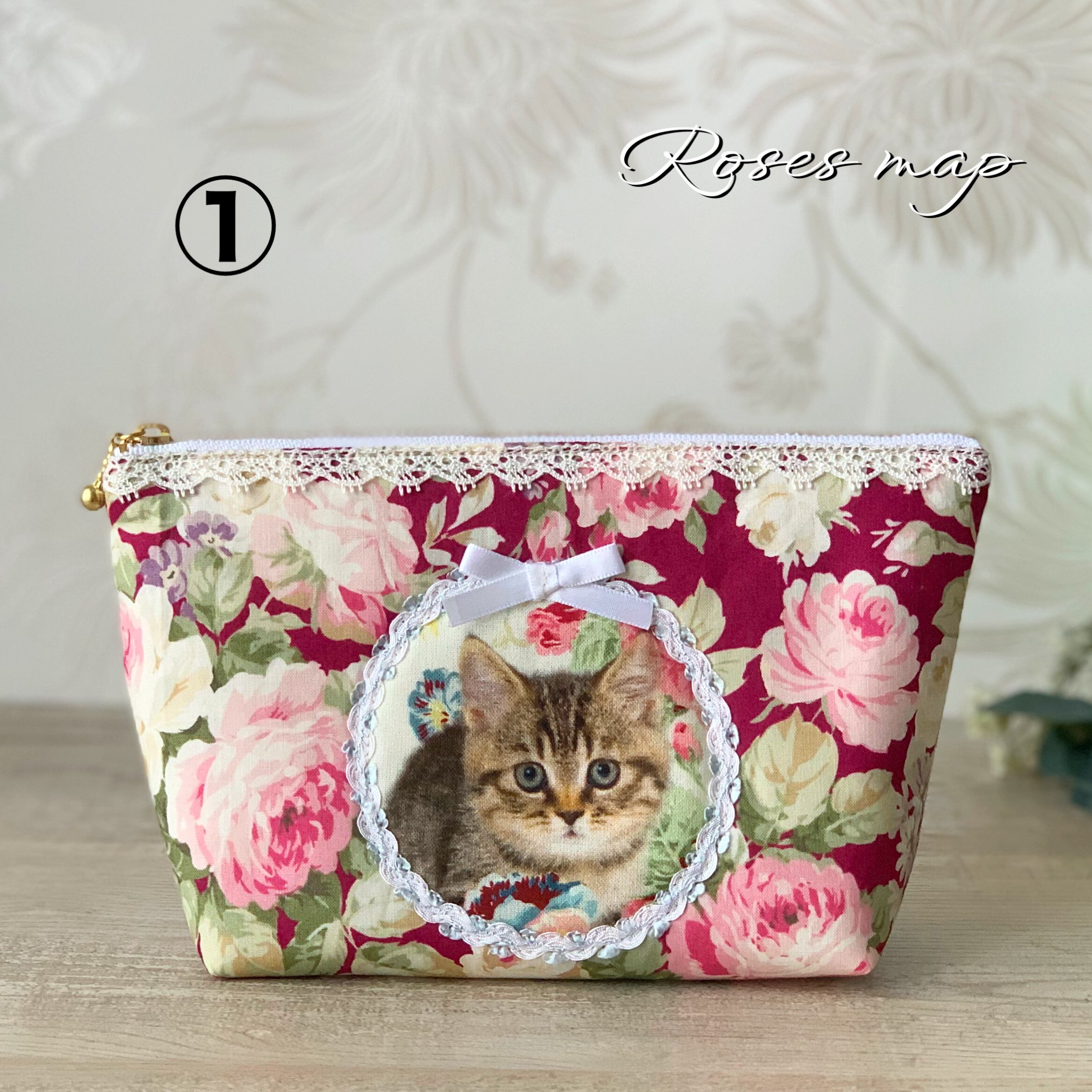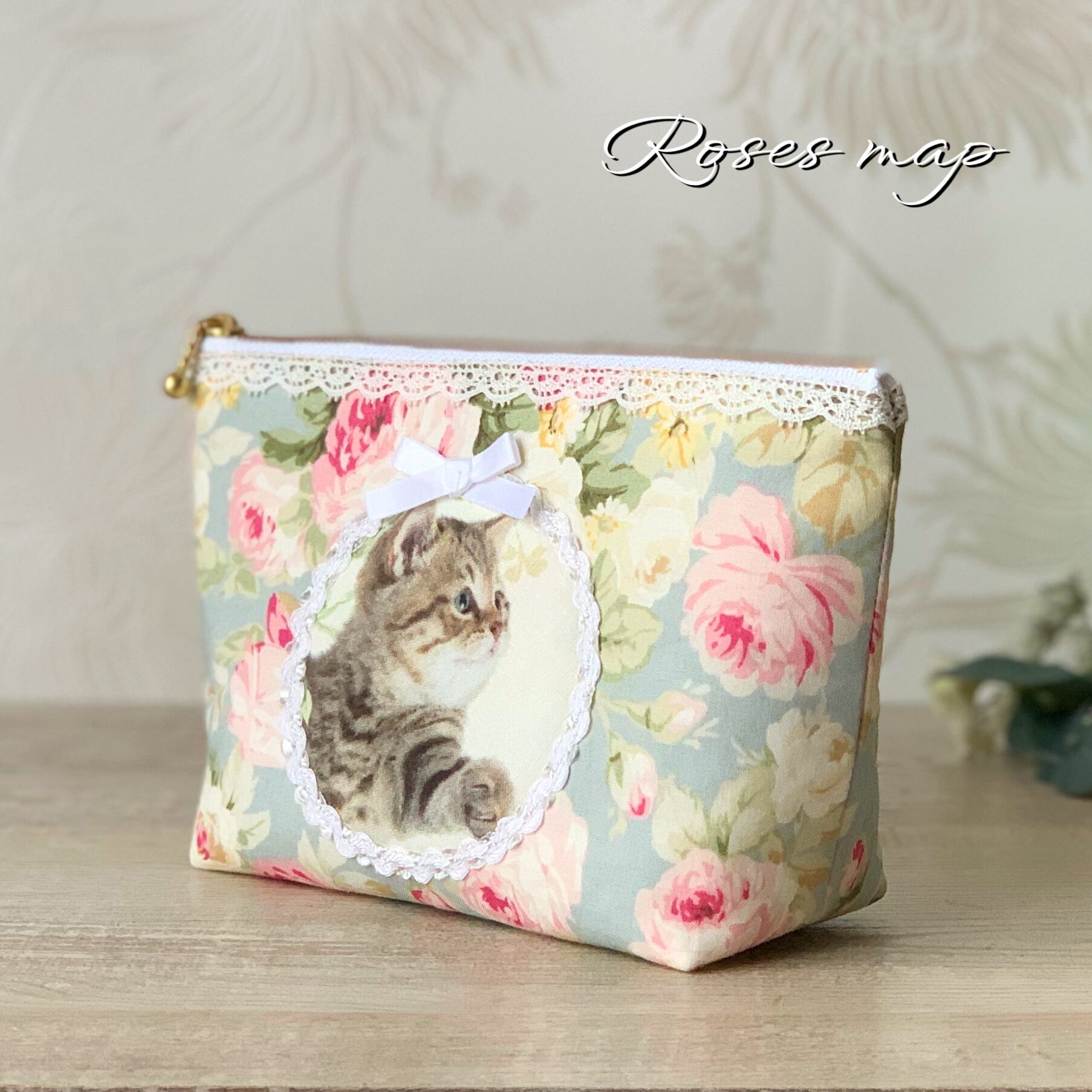 薔薇の中に可愛い子猫のアップリケの付いたマチ付きポーチ。
