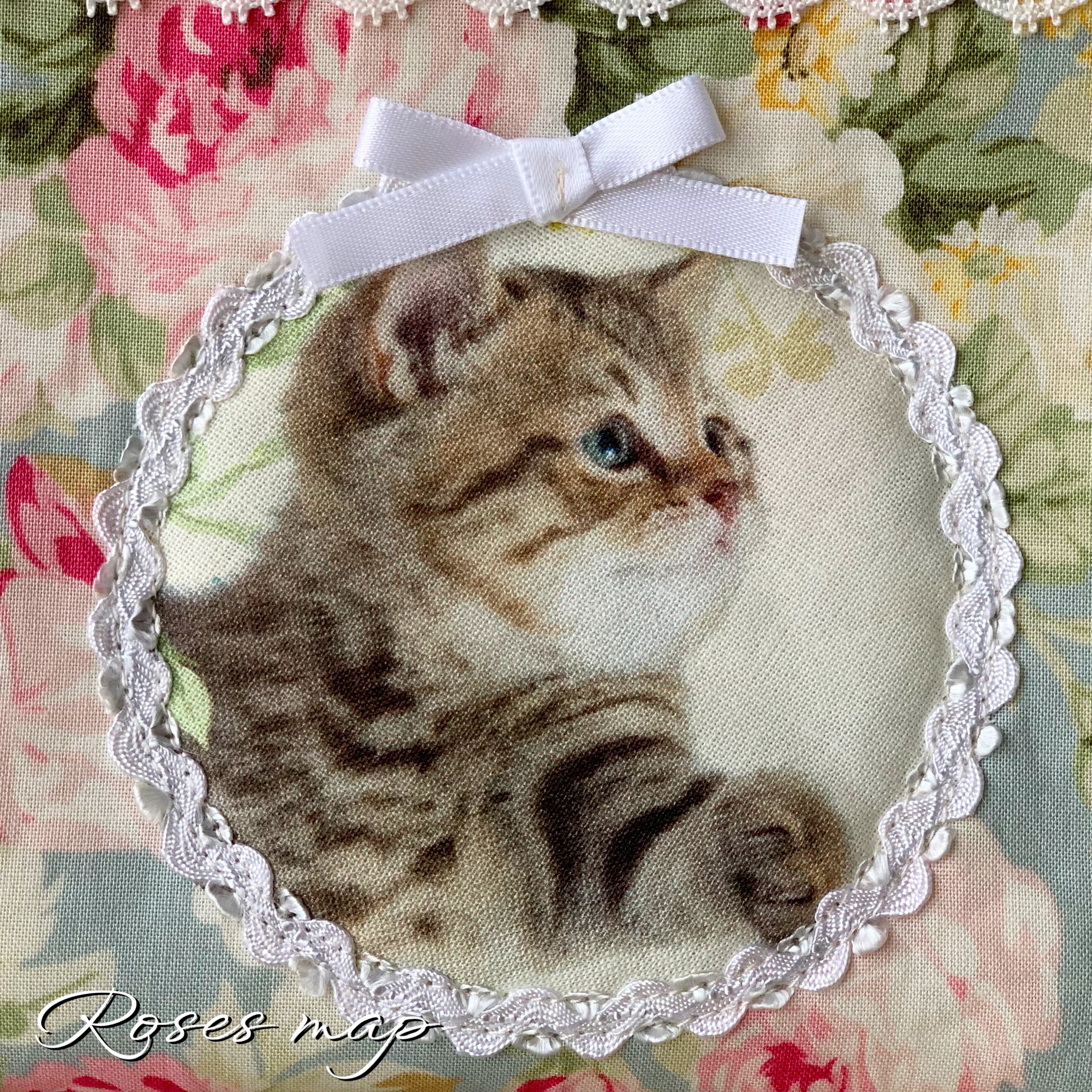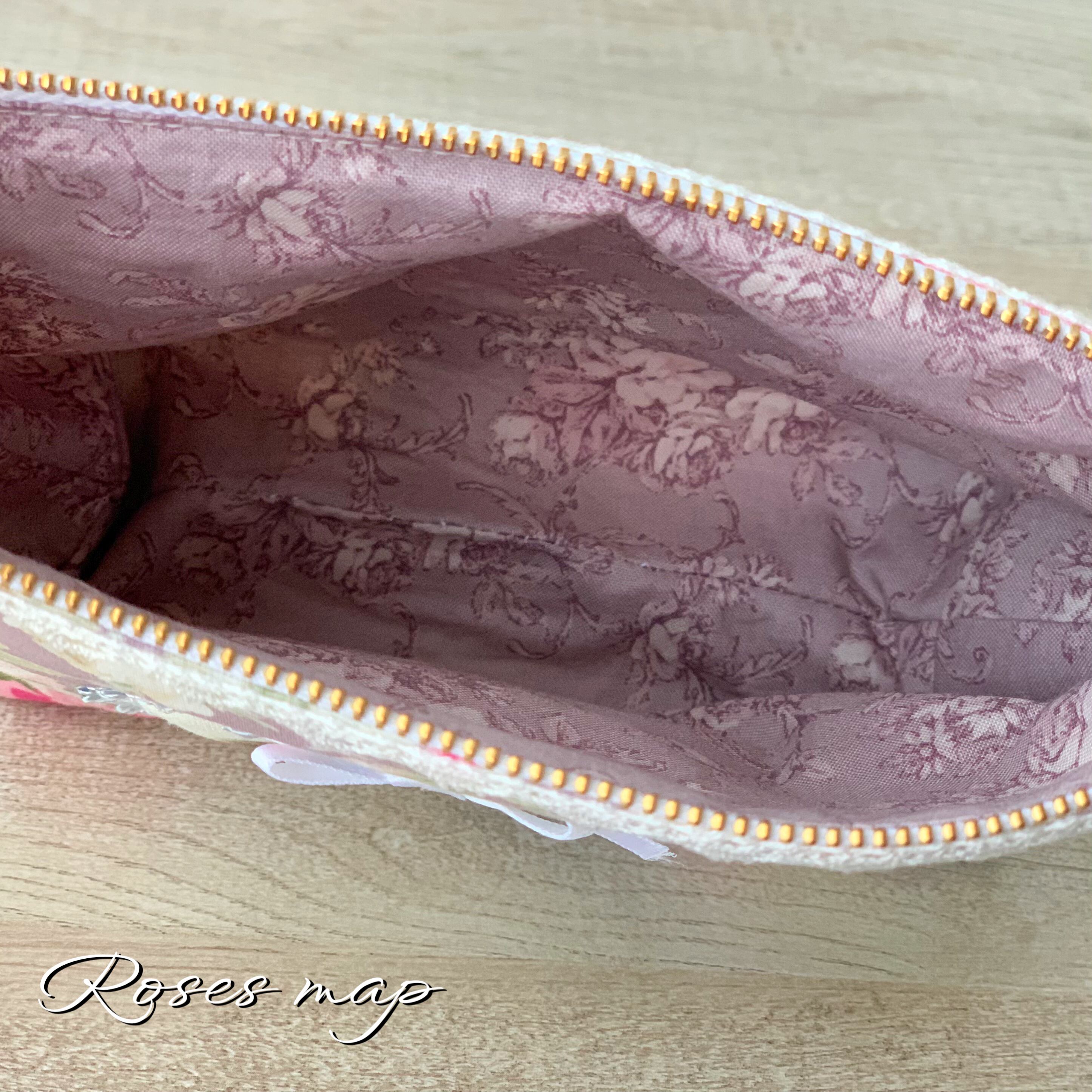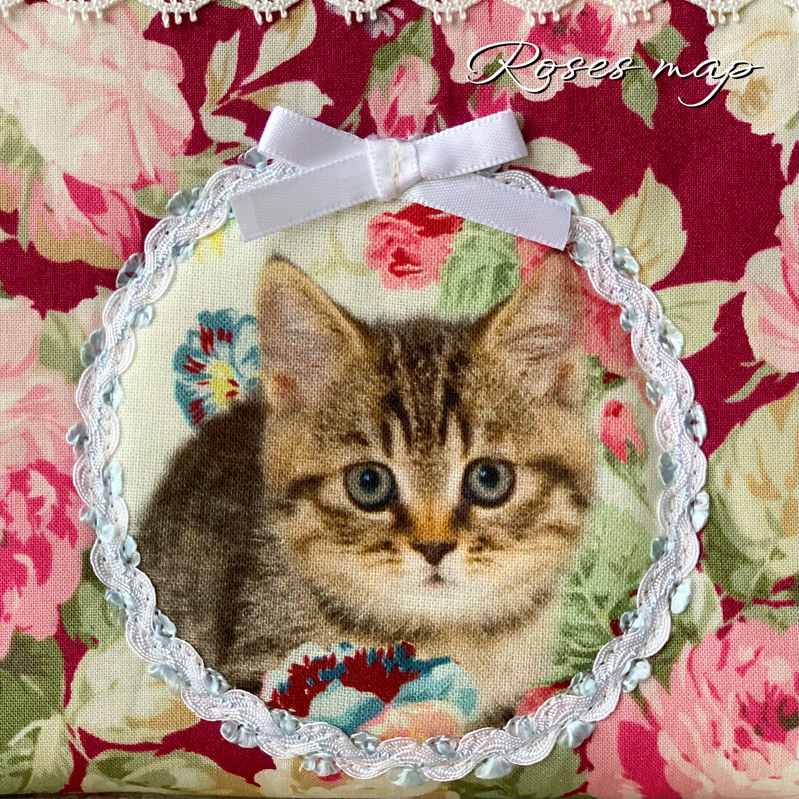薔薇の中に可愛い子猫のアップリケの付いたマチ付きポーチ。