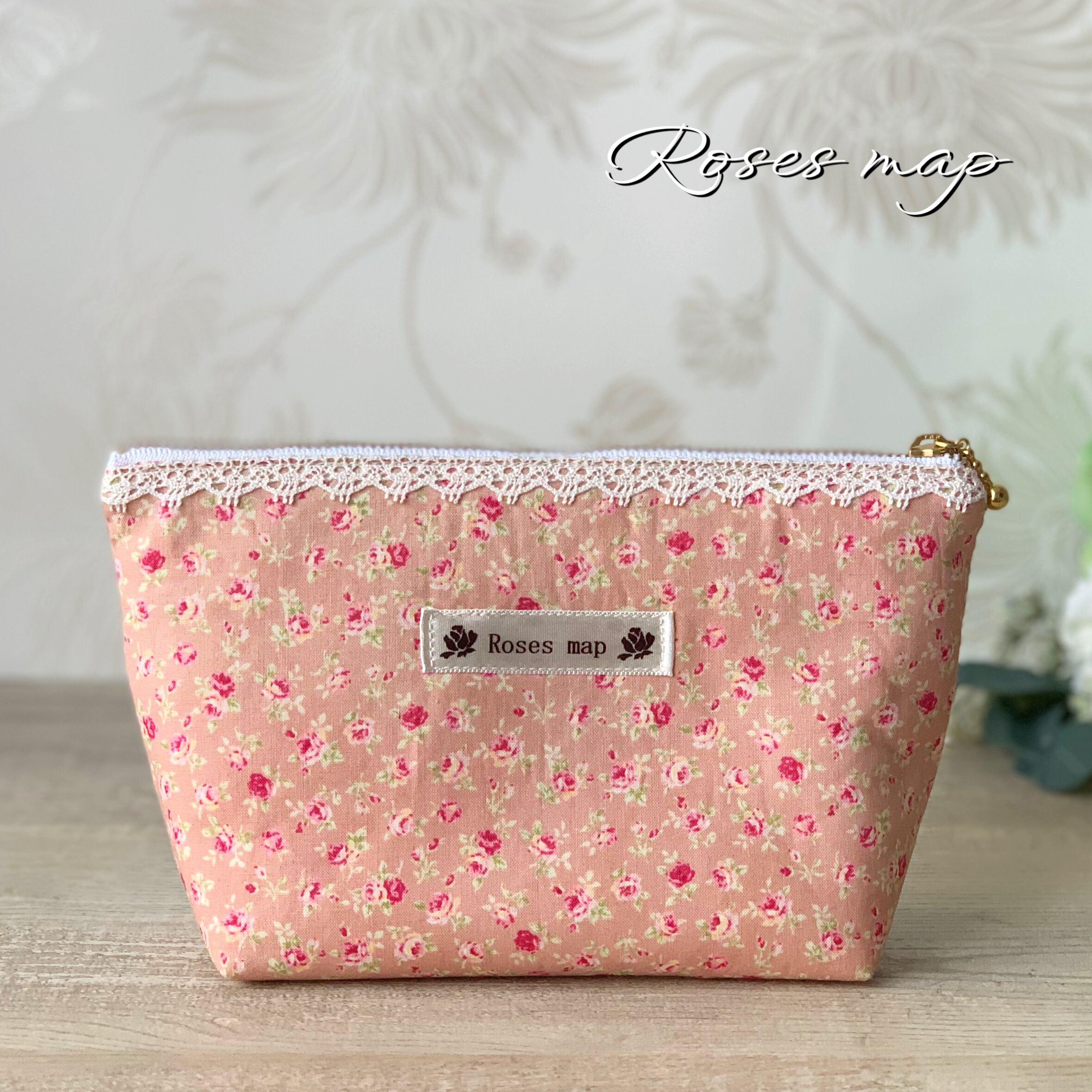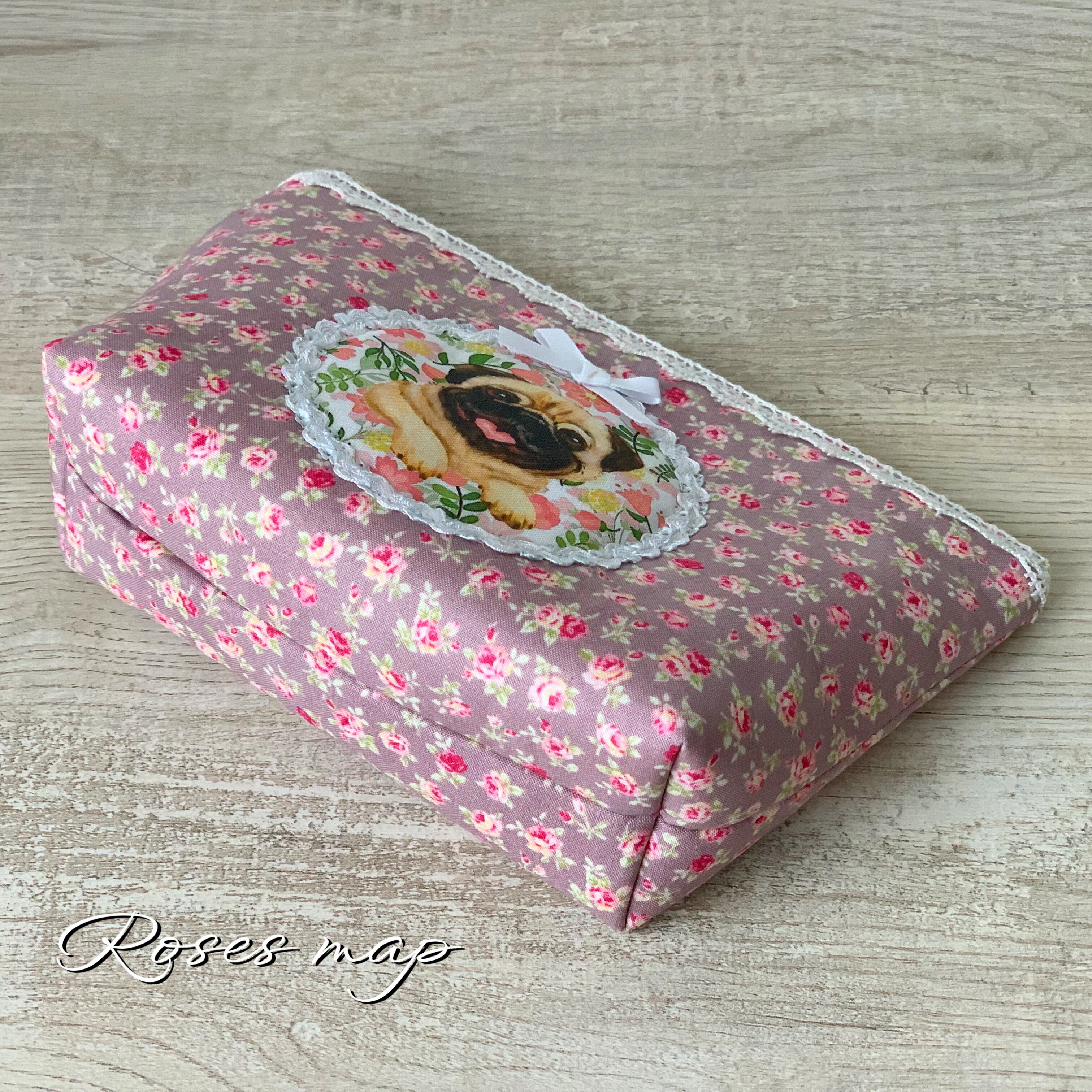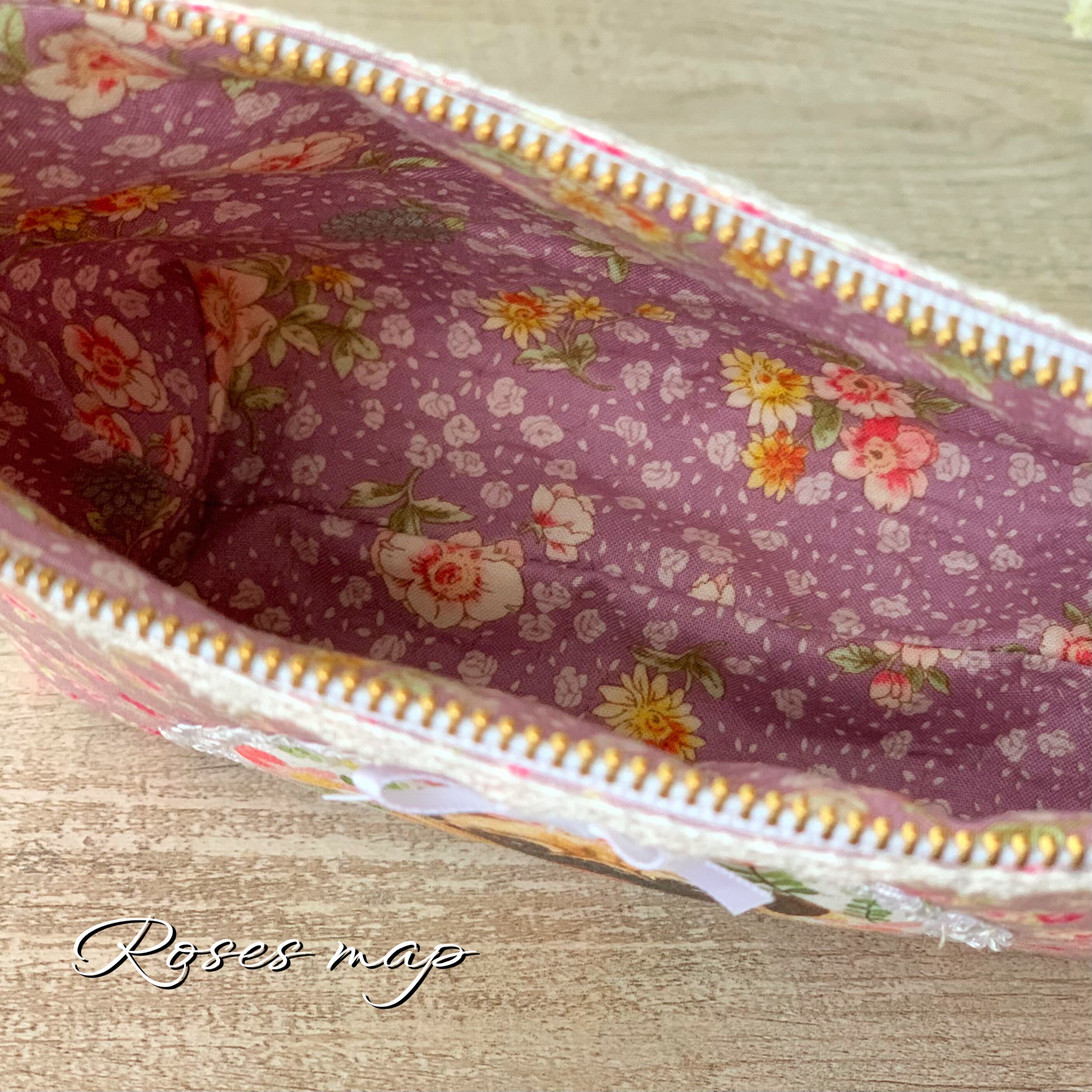 小薔薇の中に可愛いワンコたちのアップリケの付いたマチ付きポーチ。