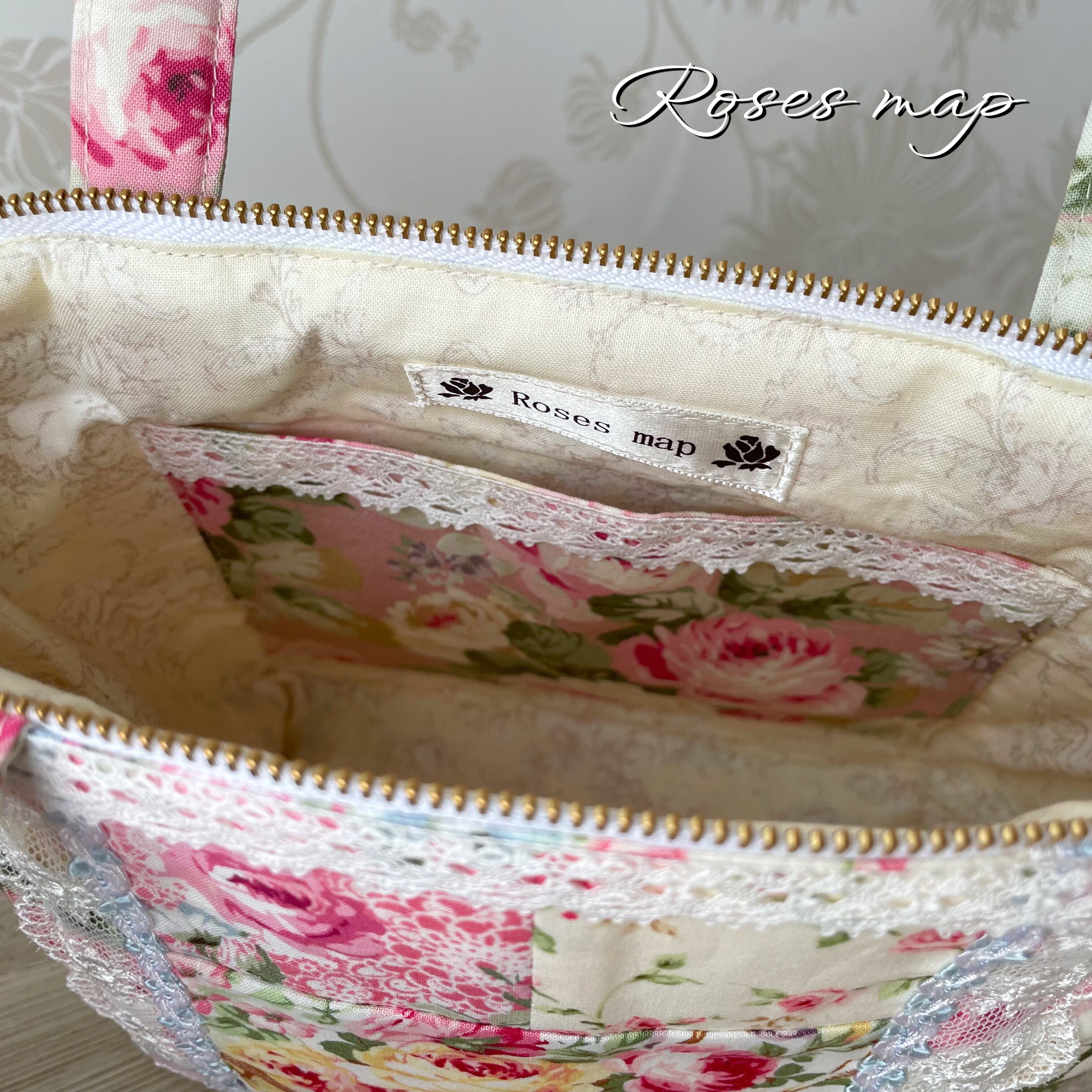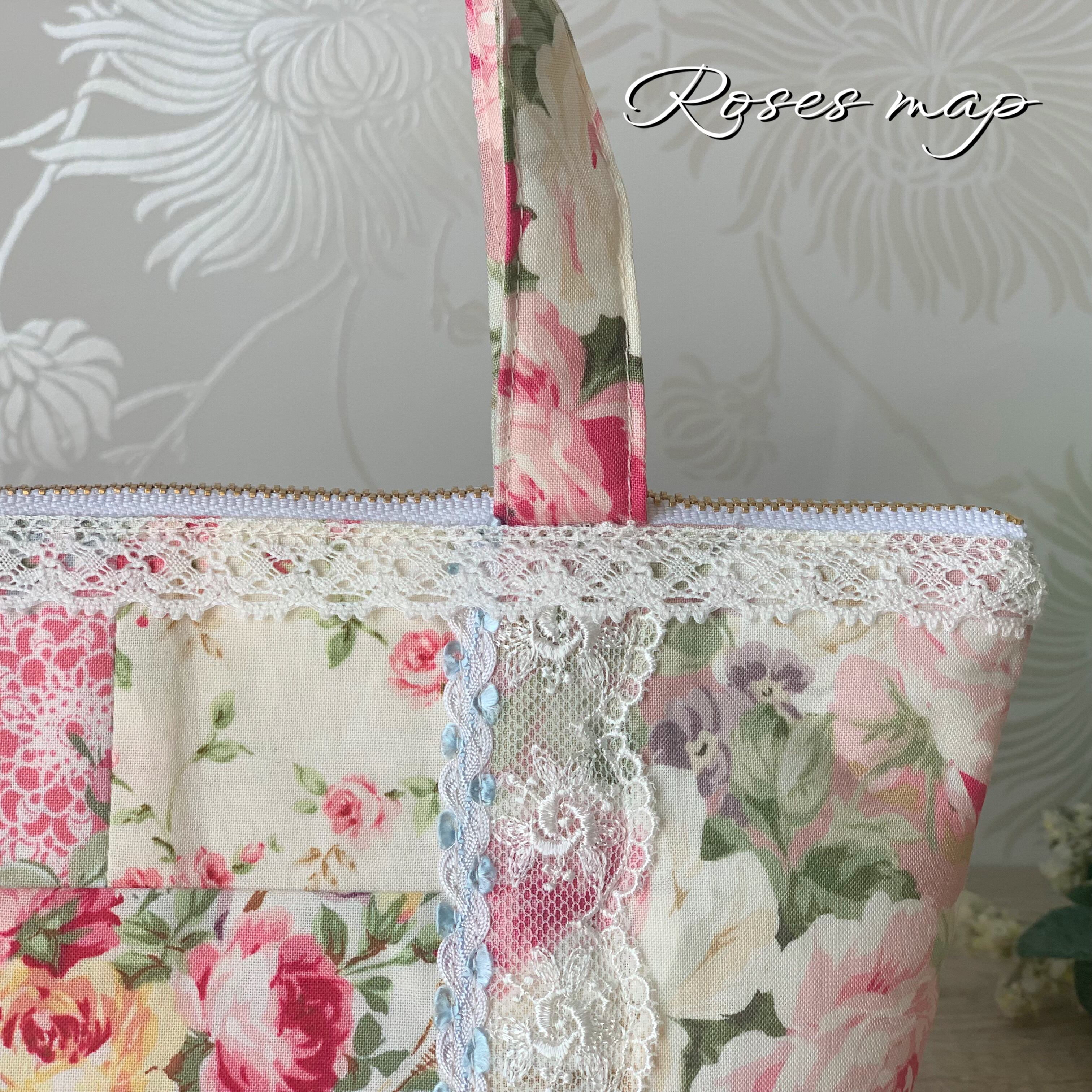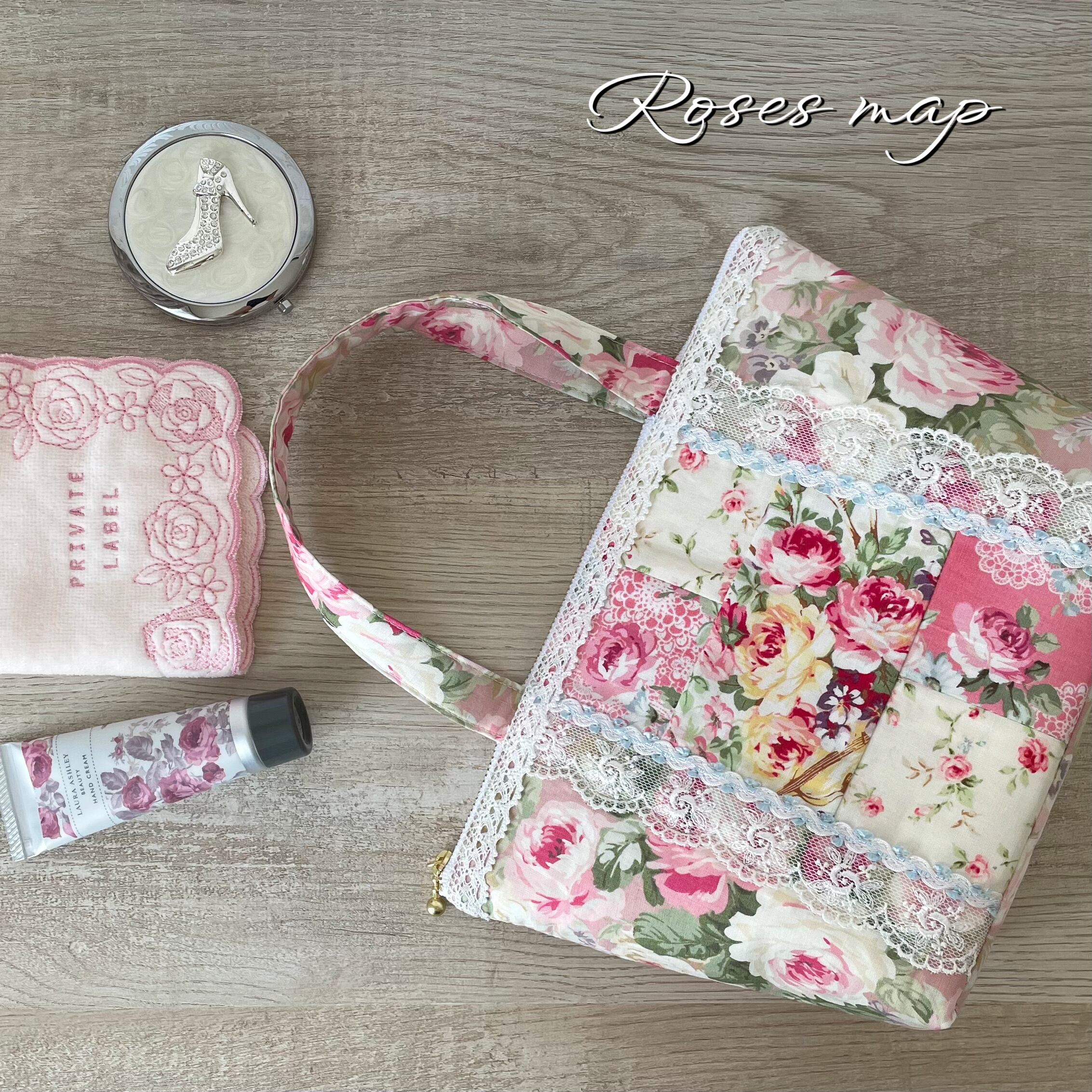 (PM-47)【ポーチ マチ付】バッグ風 取っ手付 パッチワーク おしゃれ小物 薔薇小物 ローズ雑貨