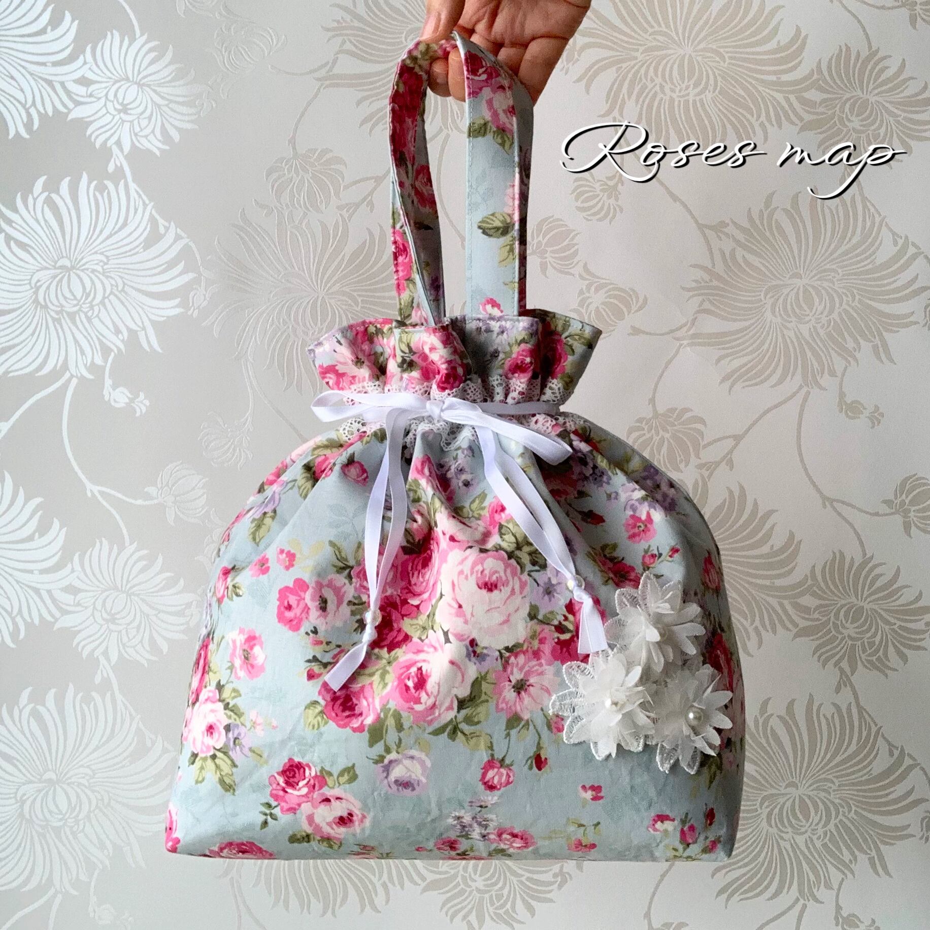 2480-11Cの生地で(O-33)お花モチーフの巾着型バッグ