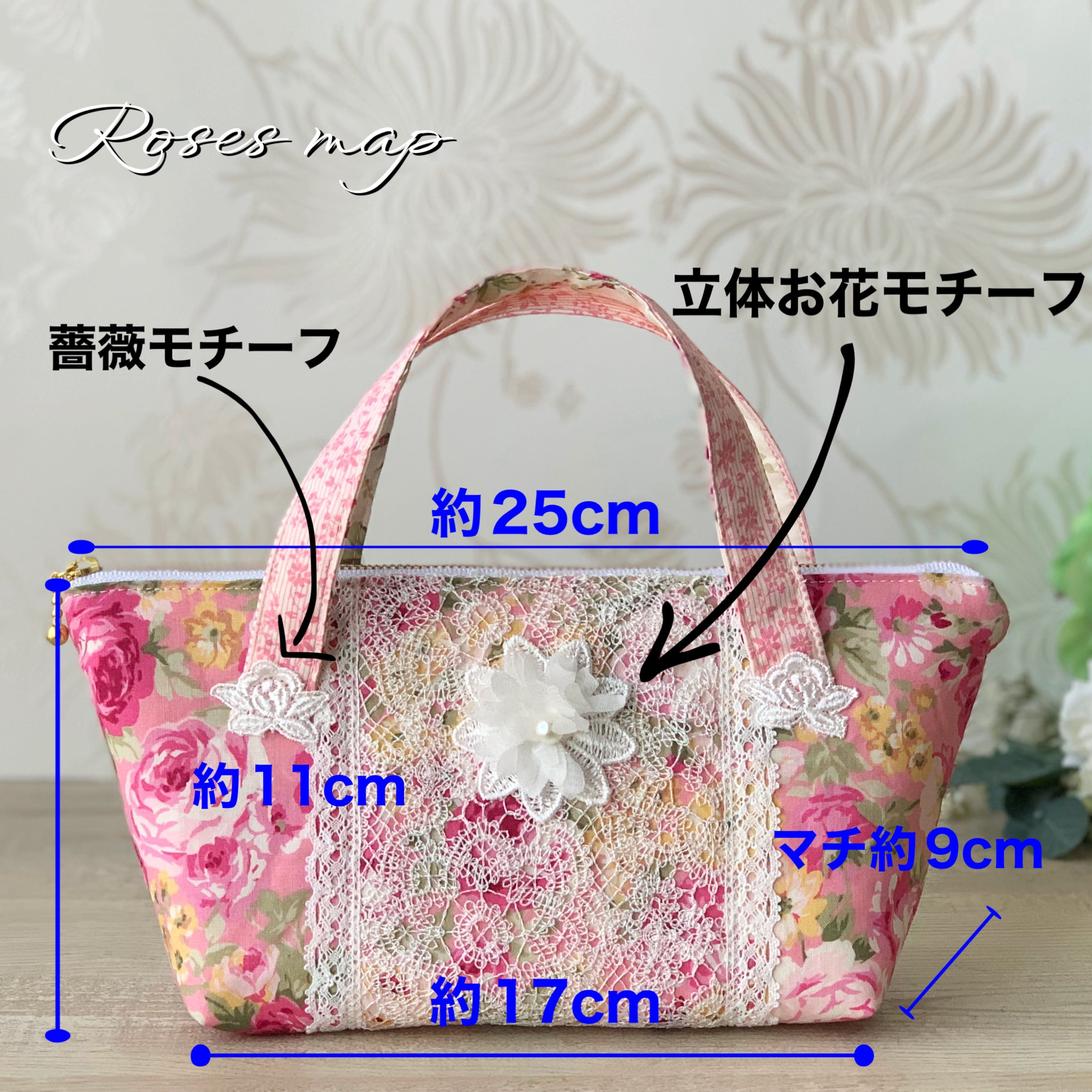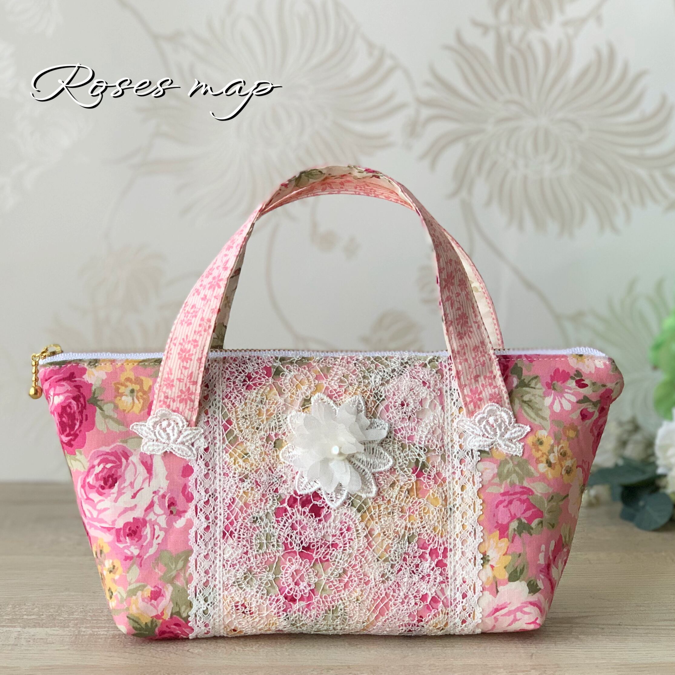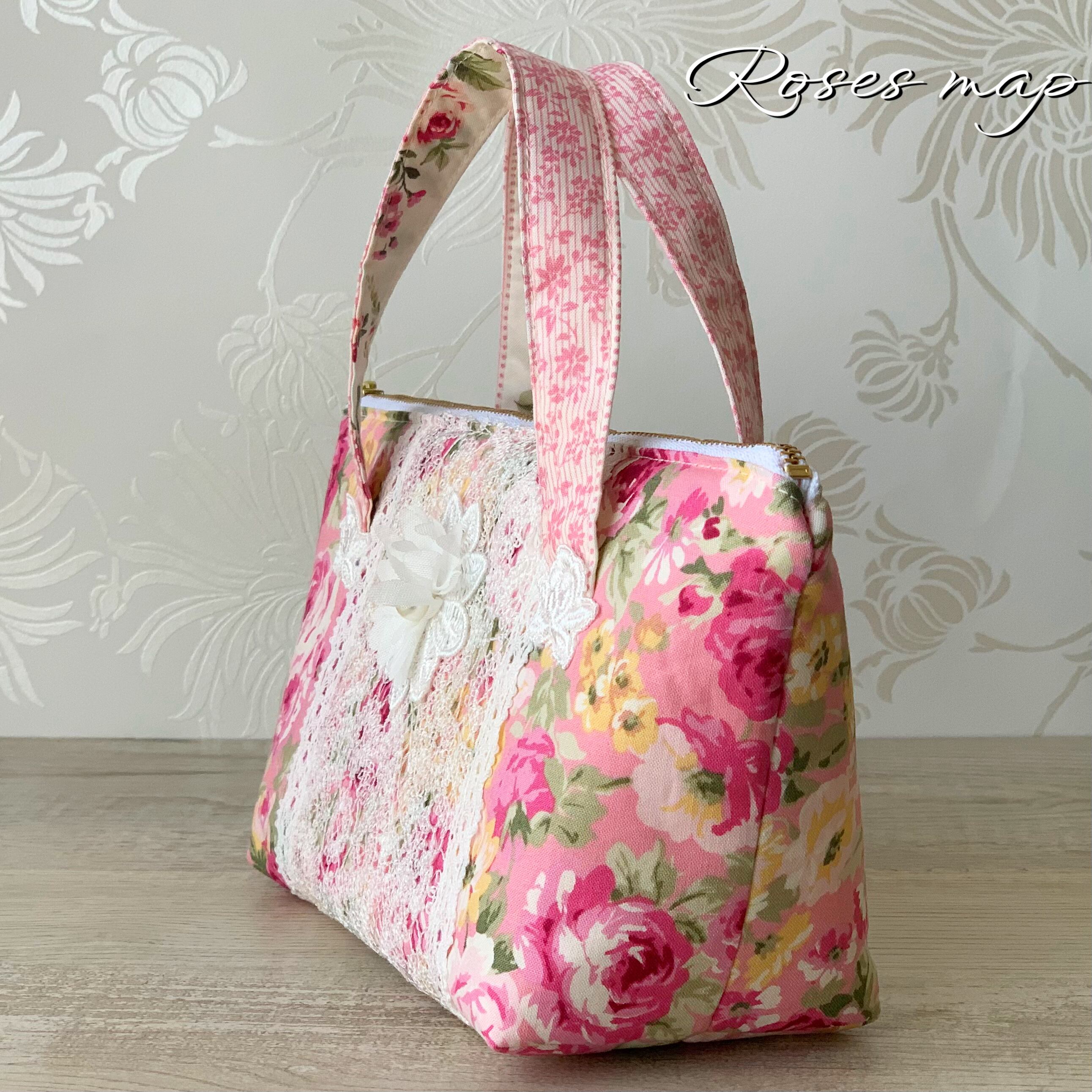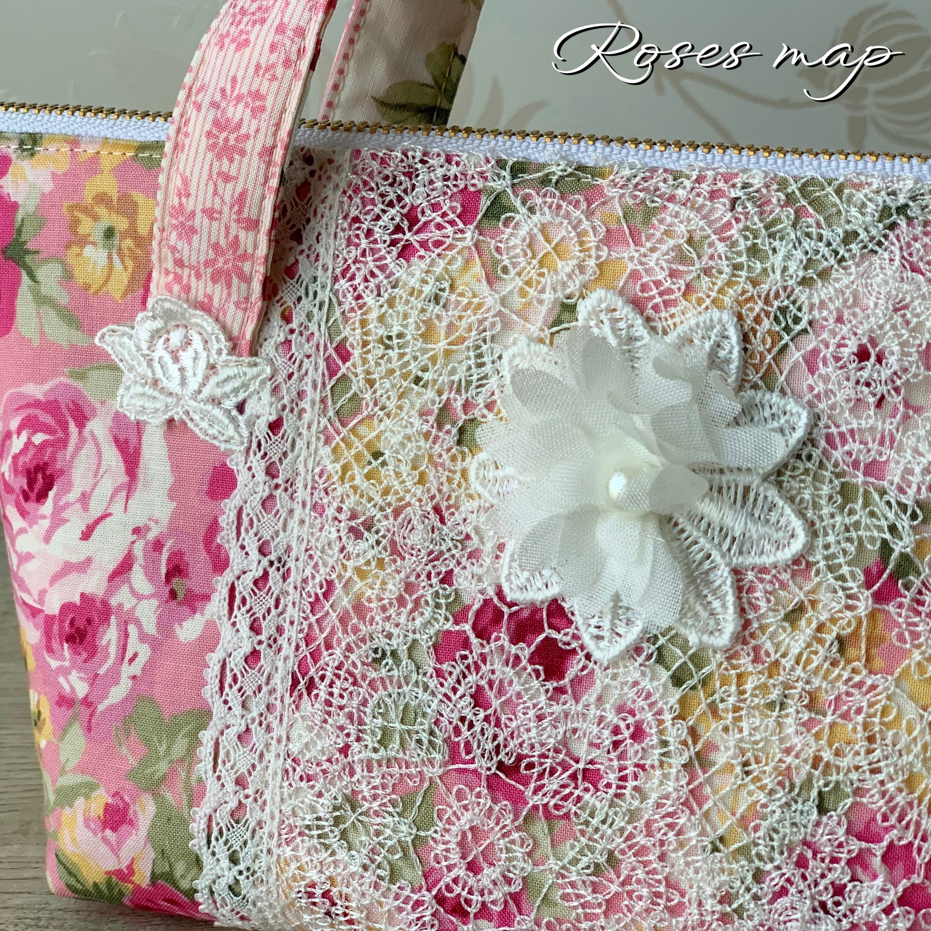 (PM-18)【ポーチ マチ付】取っ手付 立体お花モチーフとレース おしゃれ小物 薔薇小物 ローズ雑貨 ピンク