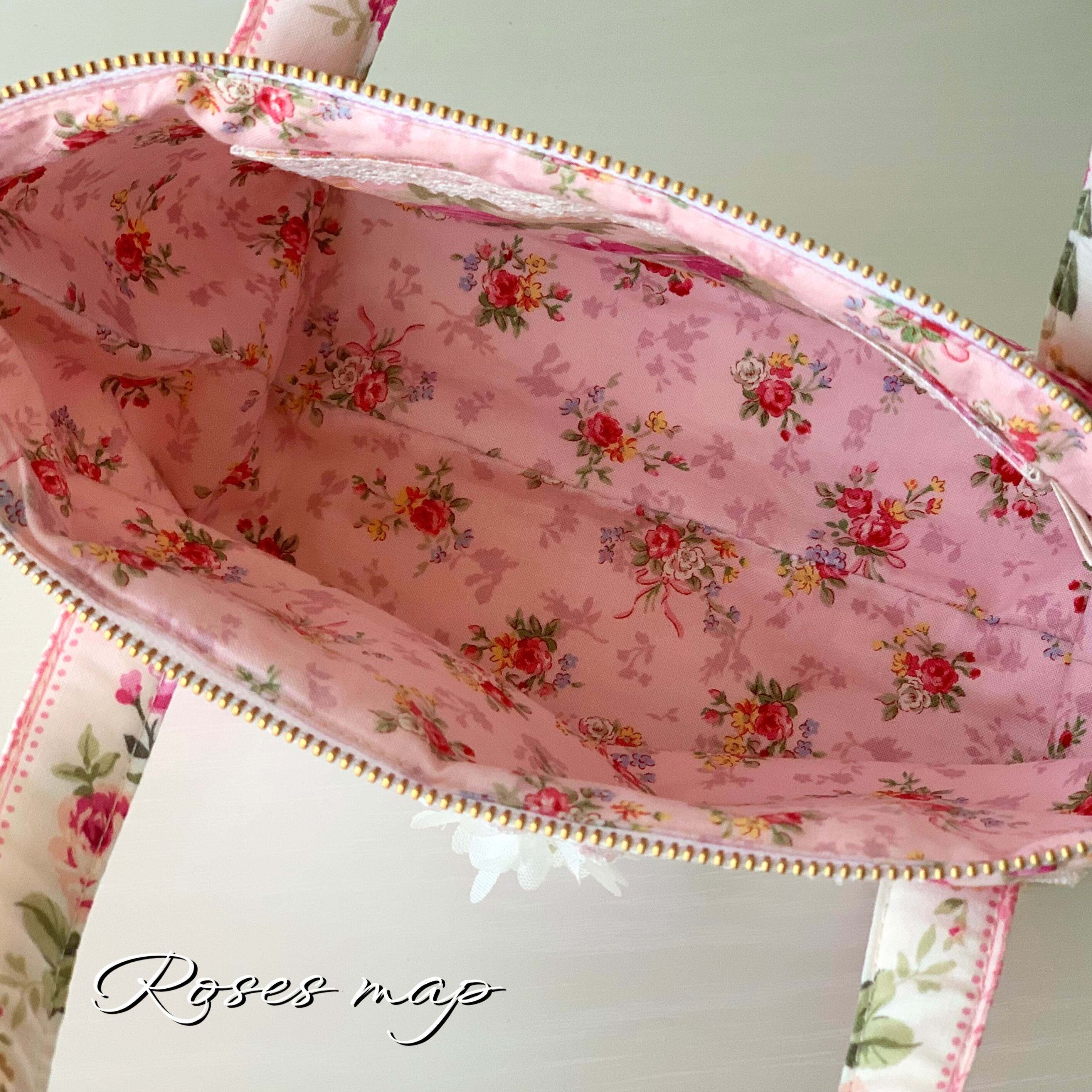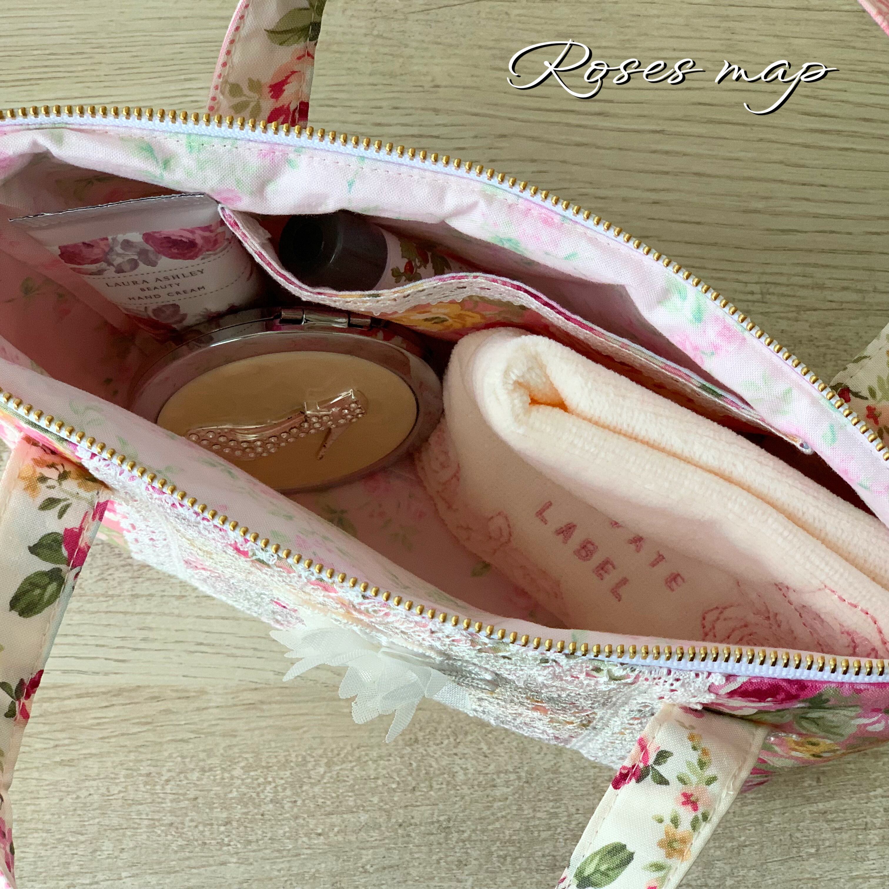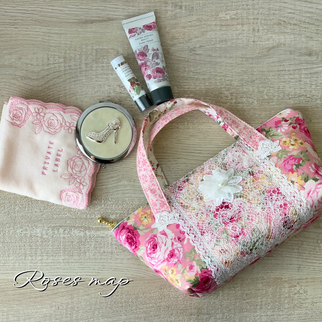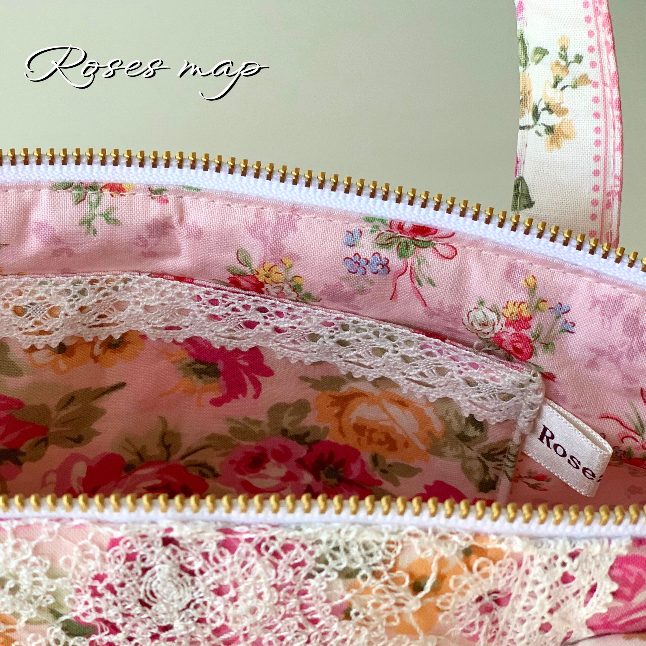 (PM-18)【ポーチ マチ付】取っ手付 立体お花モチーフとレース おしゃれ小物 薔薇小物 ローズ雑貨 ピンク