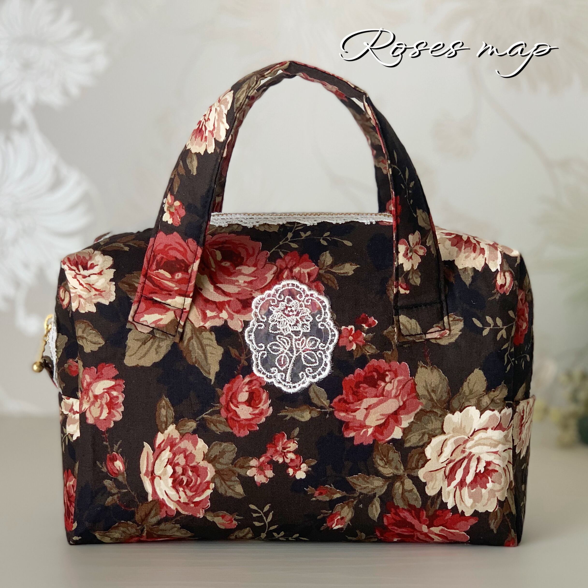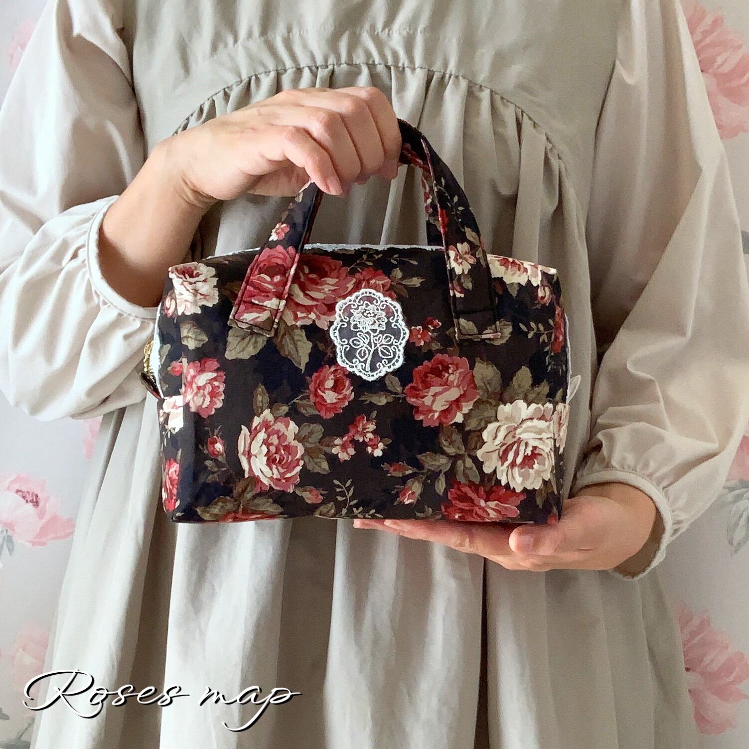 (PM-54)【ポーチ マチ付き】ロゼコレクション ボックス型 取っ手付 おしゃれ小物 薔薇小物 ローズ雑貨 ブラック