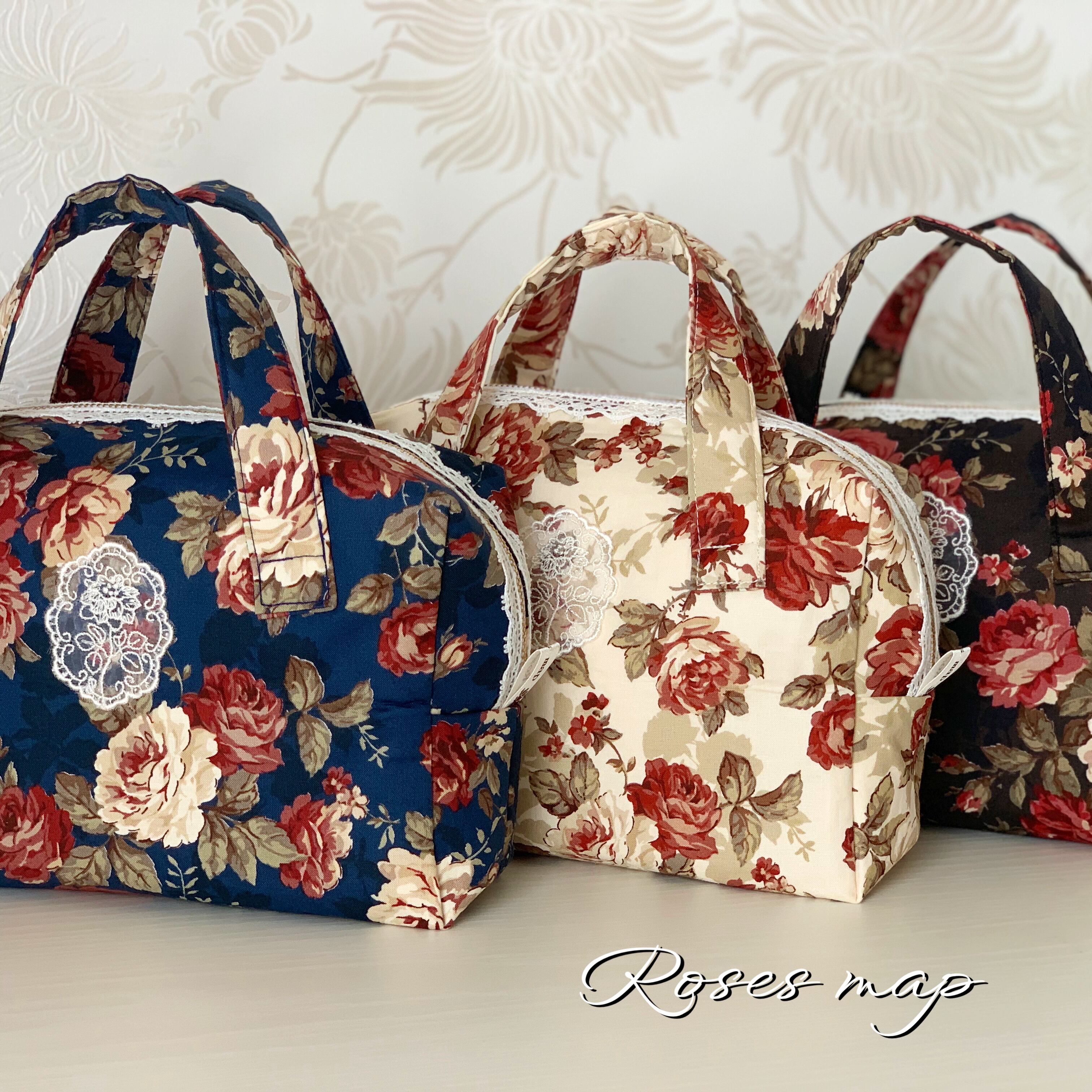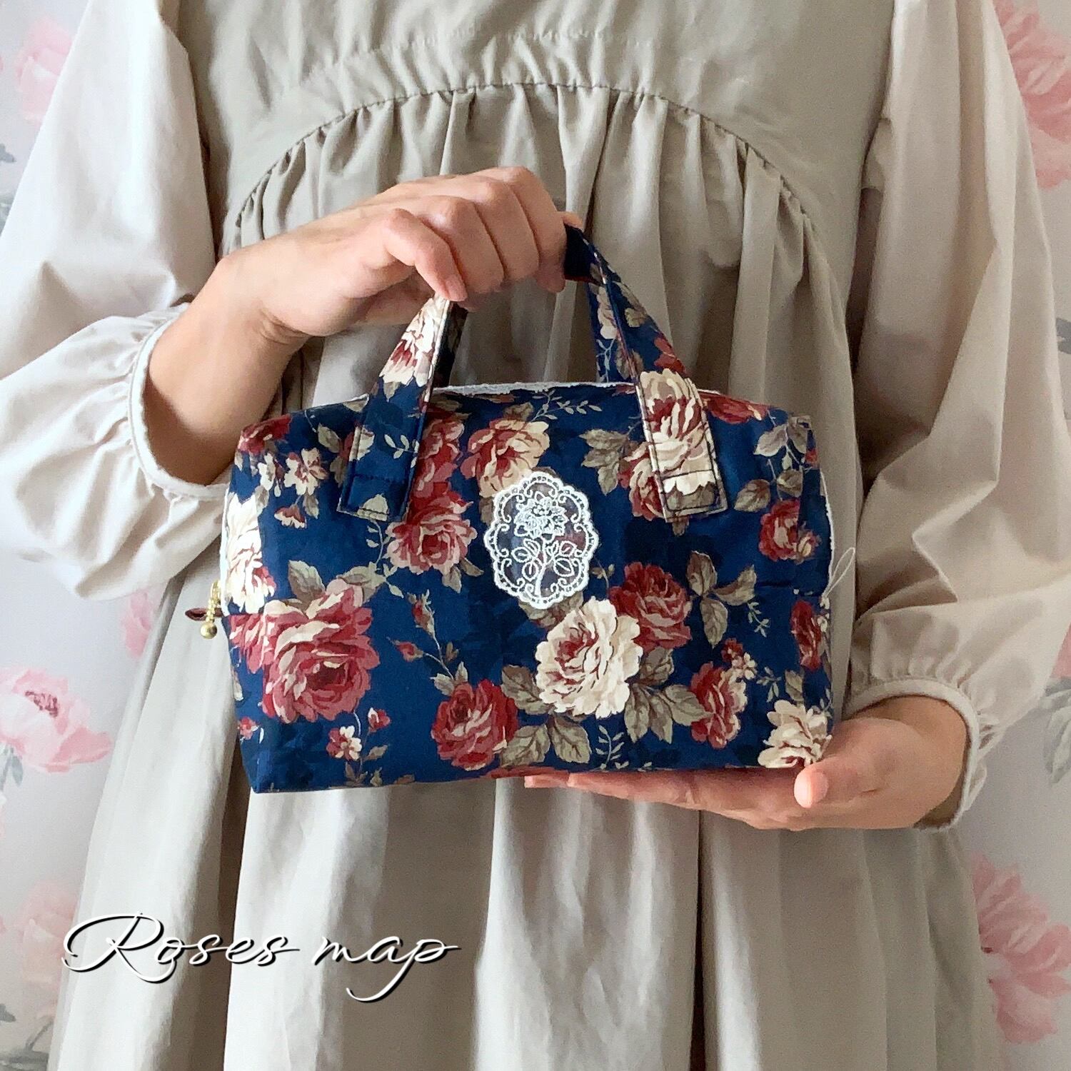 (PM-55)【ポーチ マチ付き】ロゼコレクション ボックス型 取っ手付 おしゃれ小物 薔薇小物 ローズ雑貨 ネイビー
