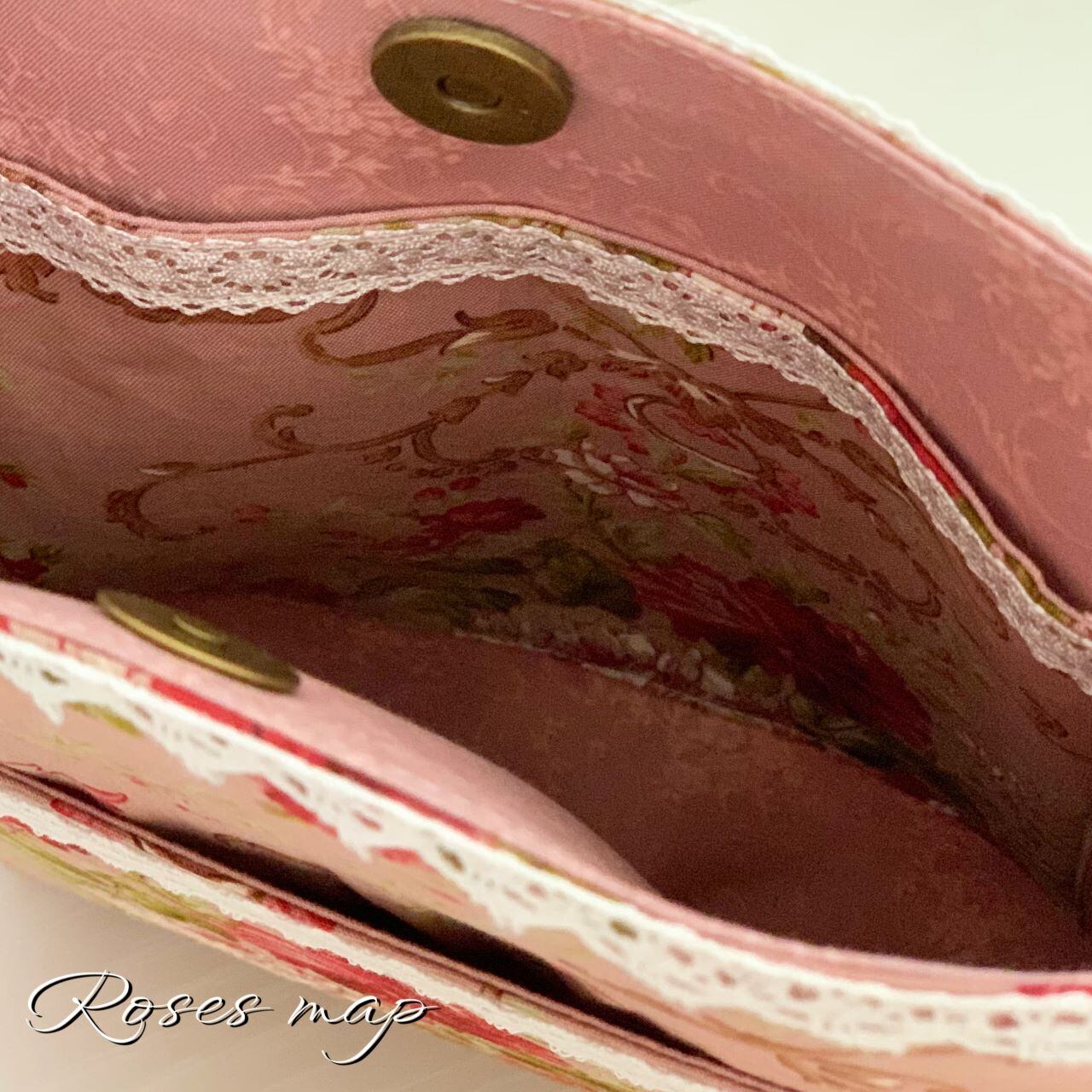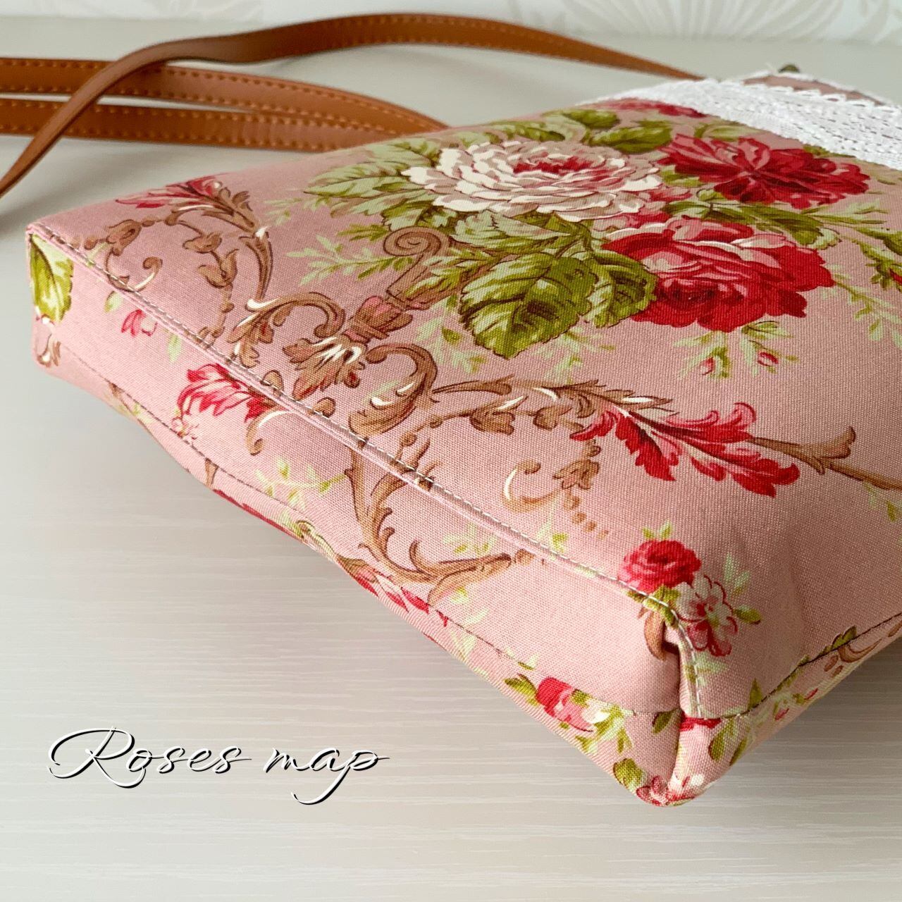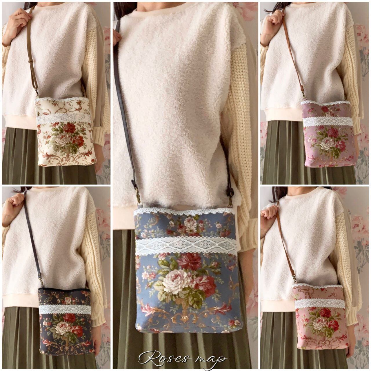(BS-12)【ショルダーバッグ】ノーブルローズ 外ポケット付 斜めがけ クラシックカラー 薔薇小物 ローズ雑貨 くすみピンク